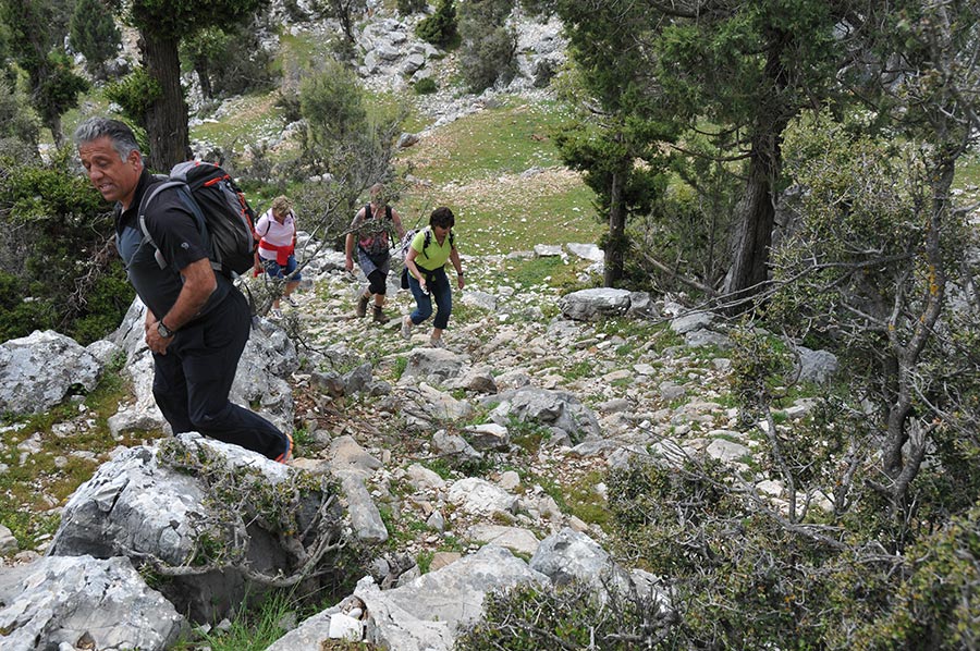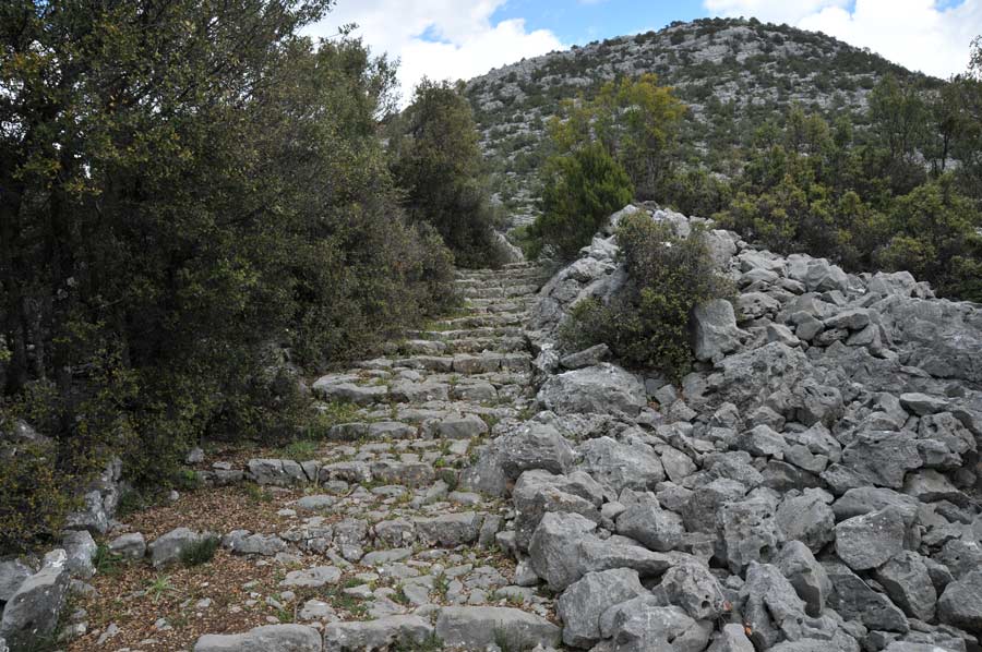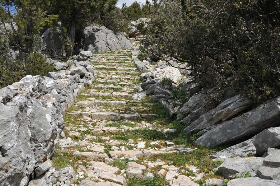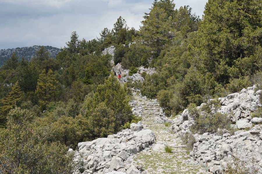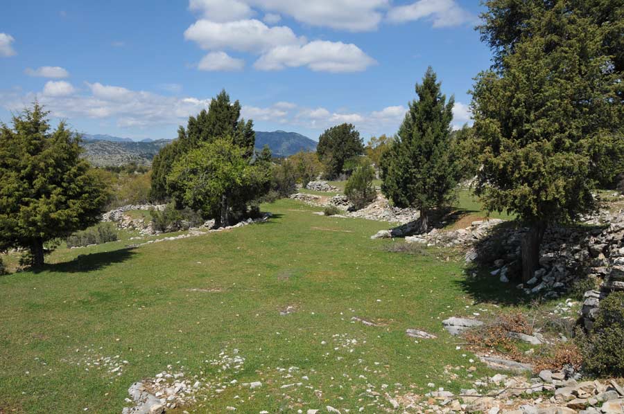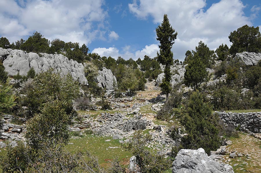 There were once terraced fields in the area that were used to grow grain, but today they are only used for grazing goats and sheep. Even today, countless paved circular areas indicate the threshing of the grain. The terraced areas are also very clearly visible; today they form bright green, short-cropped grass areas.