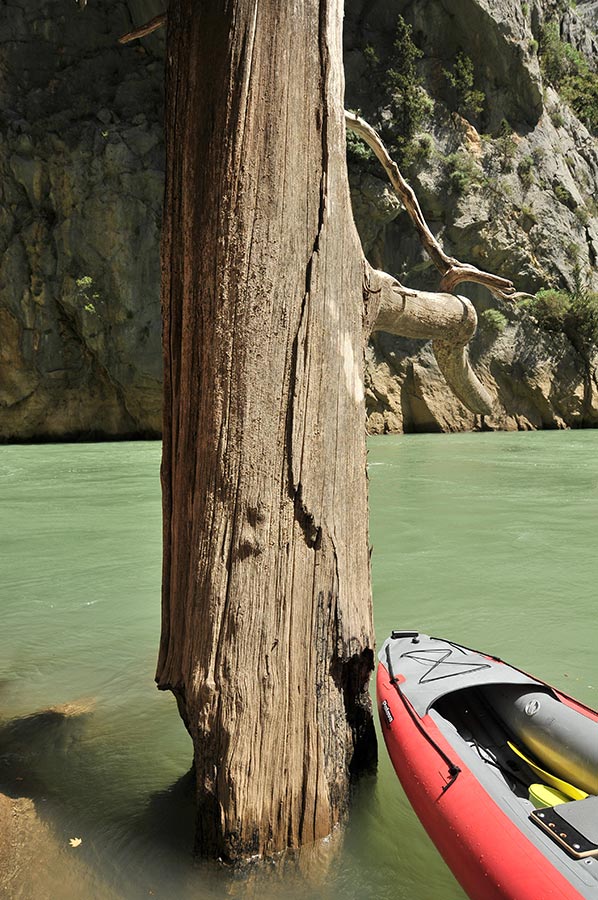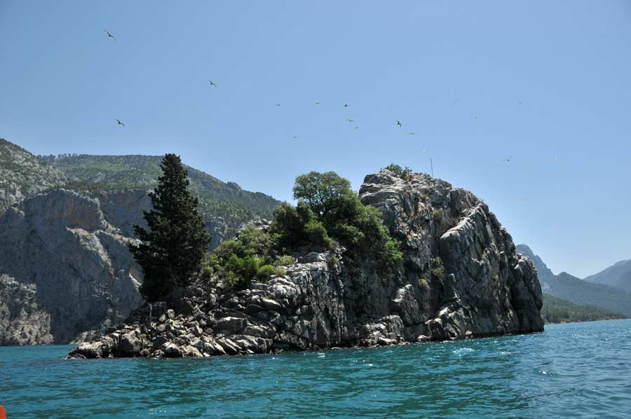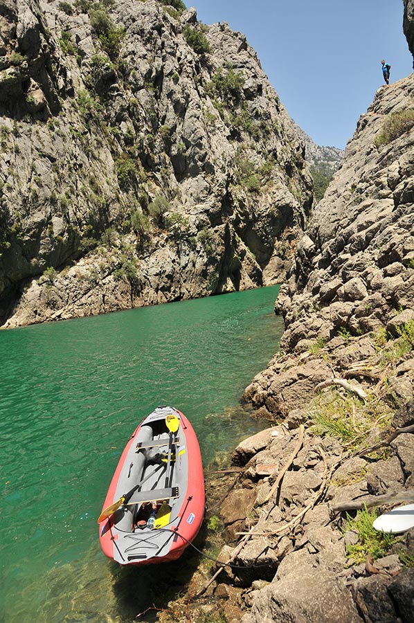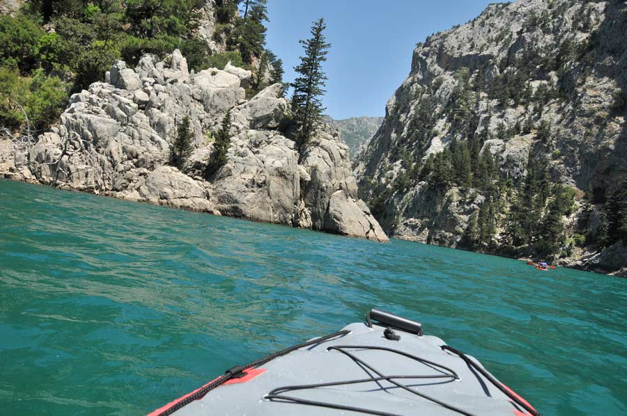 When we arrived at the pier, our canoe, which was kindly provided by Denk.com / Kanu-Klettern-Outdoor, had to be prepared for the premiere tour. Once "practiced" in the dry, inflating the three boat chambers and inserting the seat boards proved to be quick, so that all three canoes could be launched a short time later. Provisions were stowed away, the camera was mounted and off we went towards the canyon, first to what we named Bird Island, a breeding colony of terns that had discovered the Oymapinar reservoir. The differences between the two types of canoe quickly became clear: our inflatable canoe was much more sensitive to wind than the hard-shell boats, but you sat high and dry. As always, everything has its two sides.