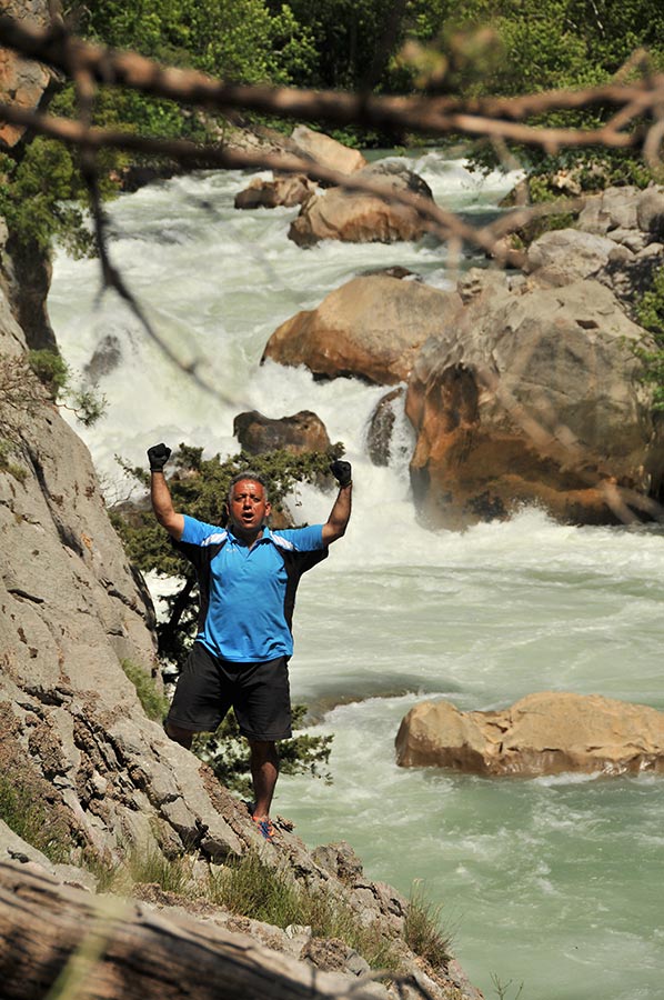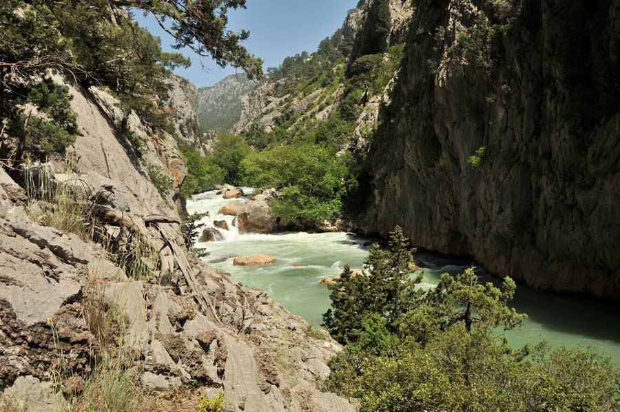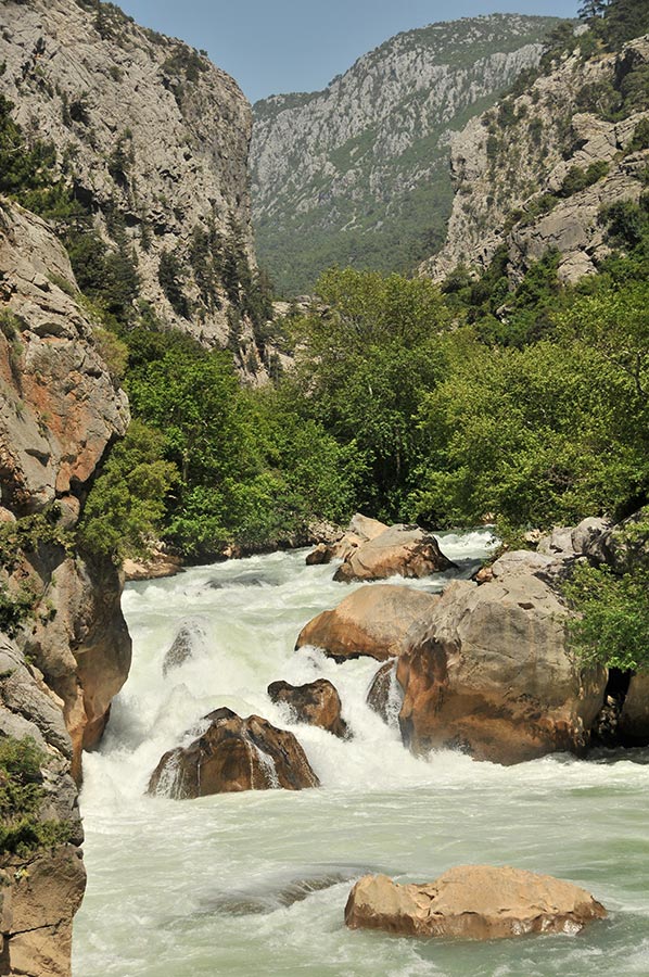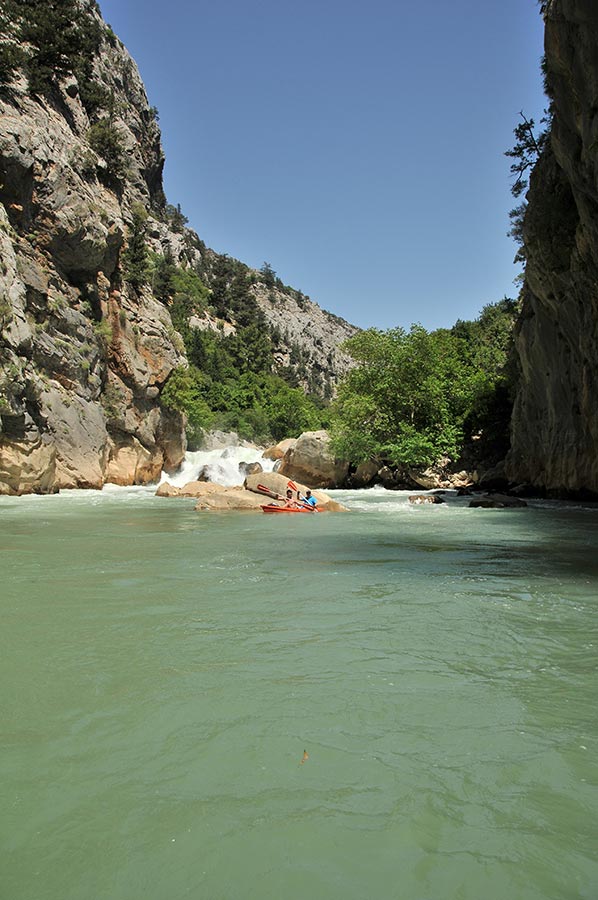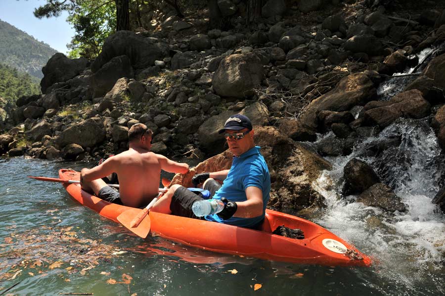 Almost at the end of the canyon we came across a small waterfall that tempted us to fill our water bottles. Delicious, really fresh spring water from the Taurus. We also used the break for a little refreshment, which involved leaving the canoes. It was an unforgettable moment and took a lot of effort to get into the really icy water. From here you could already hear the sound of the mighty Manavgat River pouring over the rocks into the reservoir.