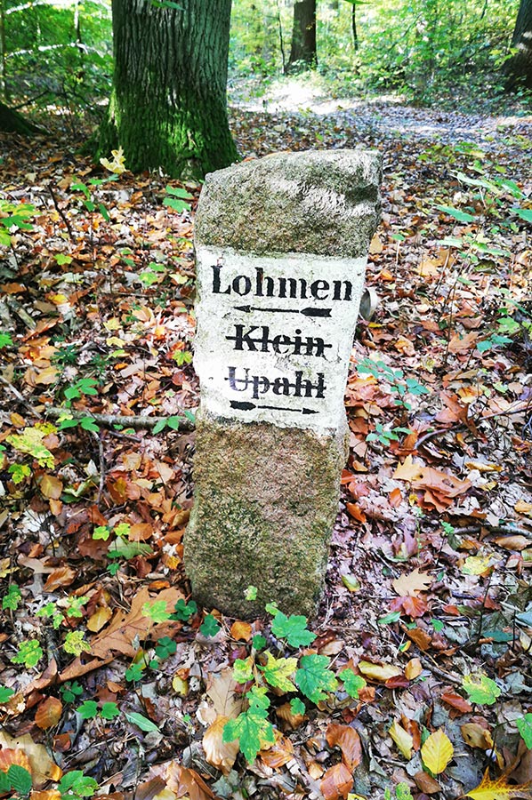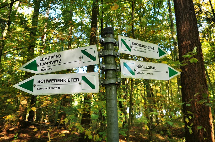 We stay on the asphalt or concrete track up to this point and follow the signs to Lake Lähnwitz, which we circle halfway around. Here a forest path turns off to the right, which we follow. It is interesting along the forest path at Lake Lähnwitz that the forest here is mainly made up of deciduous trees such as beech and oak, rather than the otherwise reforested spruce trees. Especially now in autumn, there is a wonderful display of colours through which the sun breaks. A little later we reach our destination and are once again disappointed by the condition. The rock formations are barely recognizable, even the explanatory signs are old and barely legible. A real shame!