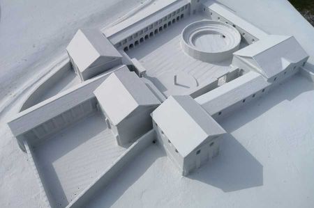 The parts of the building of the approximately 2,800 square meter gladiator school were grouped around an inner courtyard, in which a practice arena with a diameter of approximately 19 meters could be detected. The arena with wooden grandstand was reconstructed in 2014 at the original location after archaeological investigations.