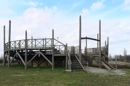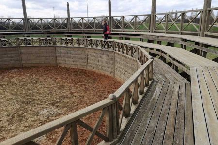 Based on the prospection results, parts of the gladiator school were uncovered during archaeological excavations in 2014 in order to gain more detailed information about the training arena of the gladiators. Directly after the investigations, the arena with an inner diameter of approx. 14 m (46 Roman feet) and 19 m outer diameter and two rows of spectators was rebuilt exactly at the point where the original arena stood around 1800 years ago.