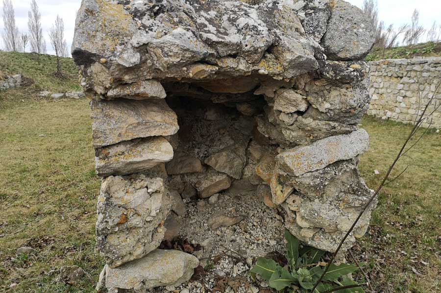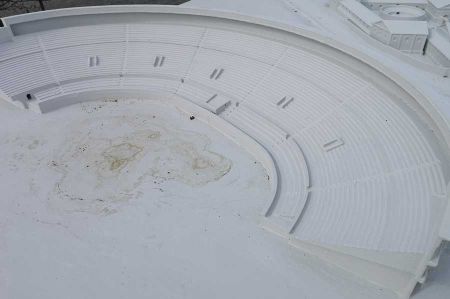 The arena of the amphitheatre was surrounded by grandstands 25 meters wide on both sides of the gates. Stairs and stair towers led to the higher ranks. A hexagonal basin from the 4th century AD made from reused building blocks outside the southern passage could be interpreted as a font, but this is not certain. At this point the amphitheatre no longer served its actual purpose.