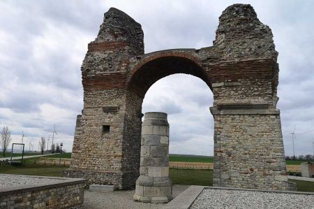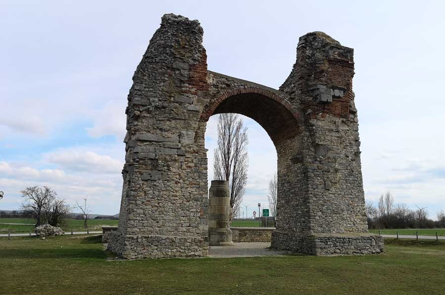 Likewise, the area around the Heidentor was probably only used as a deployment zone or for concentration of troops for border security or larger campaigns. It is also noteworthy that the monument was not placed directly on the edge of the Limes (via iuxta Danuvium) or on Bernsteinstrasse, but rather was built between these two very busy traffic routes. Until the early 5th century, Rome made great efforts to maintain the upper and middle Danube border. After the fall of the Western Roman Empire, legion camps and civil cities were abandoned and fell into disrepair. The buildings were demolished and their building materials were reused - stones from Carnuntum could even be found in the masonry of Vienna's St. Stephen's Cathedral. Due to the weathering of plant material that had been blown on for centuries, most of the remains of the foundations and walls were gradually covered; today's ground level is about one and a half meters above the ancient one. In contrast, the Pagan Gate remained widely visible over the centuries.