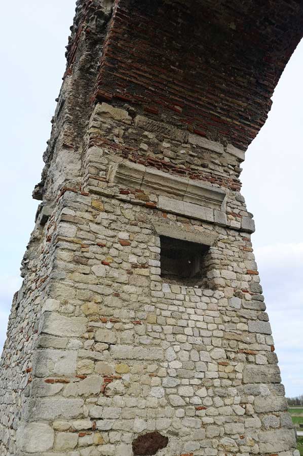 The pagan gate is a quadrifrons, a monument with double passages over four pillars. The outer dimensions were those of a cube with a side length of 14.5 meters. The mighty figure base in the centre of the pagan gate prevents an unhindered passage and suggests the interpretation as a triumphal monument. On the approx. 4.3 m high figure base there probably was a larger figure.