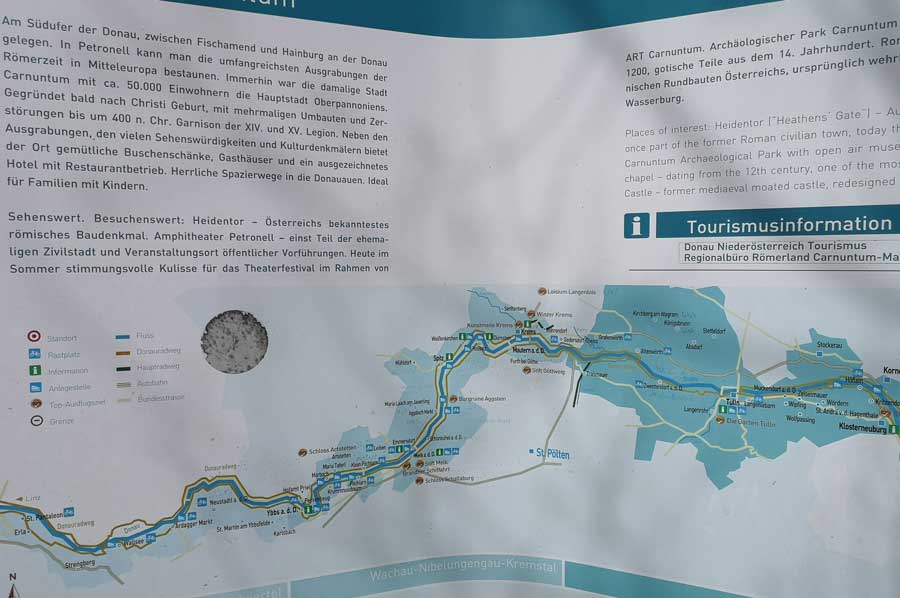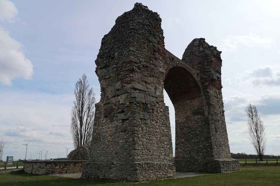 We had memorized the site plan with the location of the pagan gate fairly precisely, we even had taken some site map photos, but then estimated the distance as less. The Heidenor is located about 900 m south of the civil city of Carnuntum, far from the gates of the civil city. Archaeologists suspect that the pagan gate was built during the reign of Emperor Constantius II (AD 351–361). Fortunately, once at the country road to be crossed, the ruins of the pagan gate were visible. On the way back we recognized a better route, especially since the route we chose also led across train tracks. Better signage from the amphitheatre would have been desirable here.