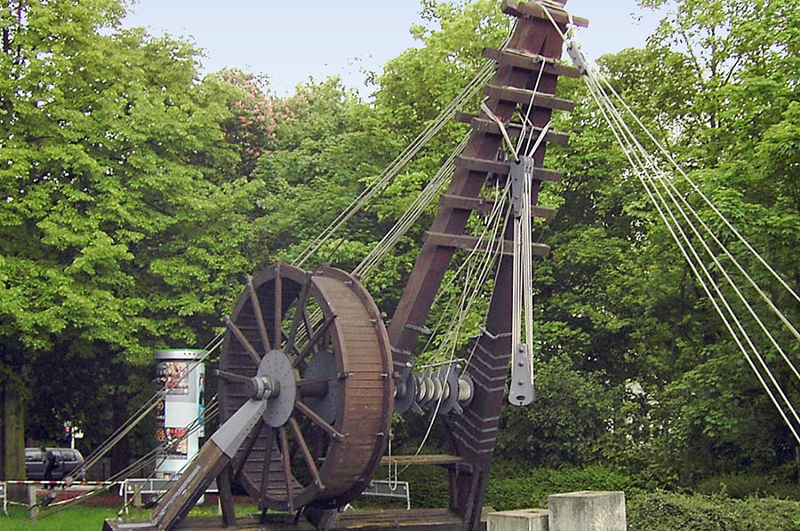Many devices were powered by human muscle power - the potter's wheel as well as the cranes of the Roman construction industry, which often moved heavy loads with the help of pedal wheels.