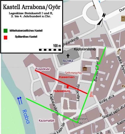 Arrabona is located in western Pannonia, the smaller Hungarian Plain. There, the Raab river and the Rabnitz river open into the Mosoni Duna, a right branch of the main Danube river. To the east of today's town of Győr, the plain continued as a narrow strip, while at Almásneszmély the ridges reach the banks of the Danube. Due to these topographical conditions, just a less fortified defensive line was needed to secure the Roman imperial border. Castles mostly were erected just at the mouth of streams and at the point where the southern branch of the arm again united with the mainstream of the Danube. The camp itself was located on a flood-safe elevation at the mouth of the Raab into the Moson Danube, now known as Káptalan Hill. A new fortification, the Püspökvár (Bishop's Castle), was erected on it during the Middle Ages above the ruins of the castle. The town administratively counted first to the province of Pannonia Superior and from the imperial reform of Diocletian to the newly founded Pannonia Prima.