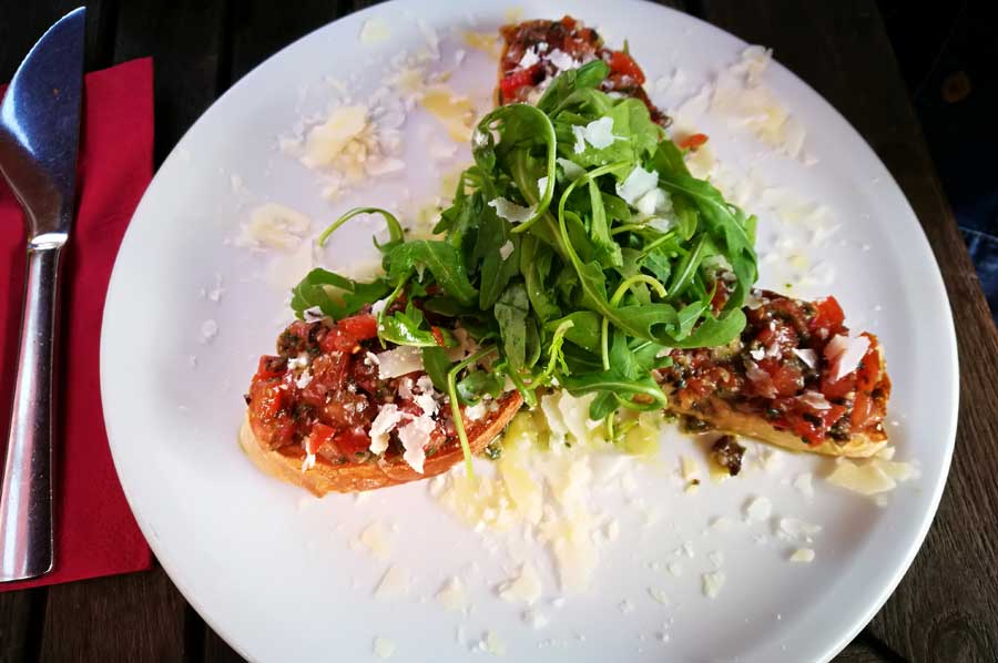 Bruschetta, on the other hand, is clearly one of the Italian antipasti, that is, a real starter. Originally called "Poor People Eating", the "dish" comes from Central and Southern Italy. Actually, only freshly toasted bread, such as Pane Pugliese, which has a fairly hard crust and rubbed warm with a halved garlic clove and then drizzled with olive oil, still peppered and salted at will and immediately consumed.