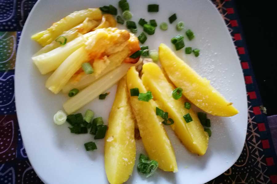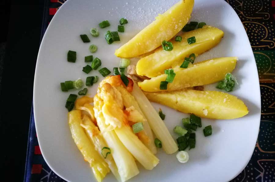 Drain the asparagus spears and brown with the cheese. Who wants to, also baked the potatoes together with cheese.