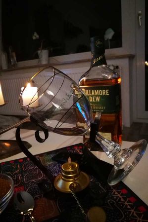 The true lover of Irish Coffee sees the culinary highlights in the preparation - and without any doubt, because in the classical preparation, the heat-resistant Irish Coffee glass is slightly wetted with a little whiskey inside. Then 2 tablespoons or bar spoons of sugar, preferably brown cane sugar, are scattered in the Irish coffee glass. Now the special, heat-resistant glass is heated over an open flame until the brown sugar caramelizes. Just the smell of sugar is another enjoyment point already. Now you take the glass briefly from the fire and put about 3-4 cl of Irish whiskey into it, which is then also heated, the alcohol begins to evaporate. There are specially made holder in the trade, in which the glass can be hung and rotated while doing so. The next highlight is then the ignition of the evaporating whiskey, which is then infused with hot coffee and thus the flame is extinguished. Finally, half whipped cream is added to the whiskey-coffee mixture. The cream is allowed to flow via a spoon onto the coffee so that it does not mix with the coffee. Sometimes it is still decorated with some grated chocolate. Irish Coffee is served classically without a spoon and not stirred, you sip the hot whiskey coffee through the cool cream.