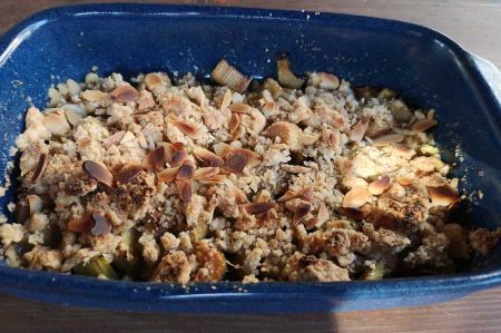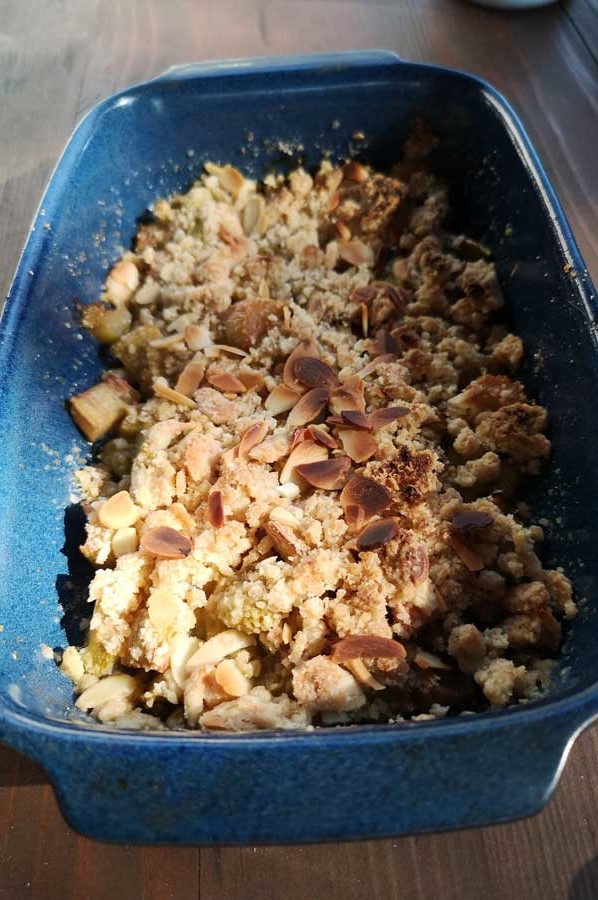 Even in many private gardens rhubarb grows lusciously, sometimes even in spring, as we should experience now. Because it was time to try the fragrant dessert. Time for freshly harvested rhubarb prepared as rhubarb crumble and served with homemade custard.