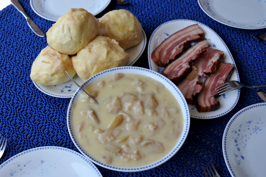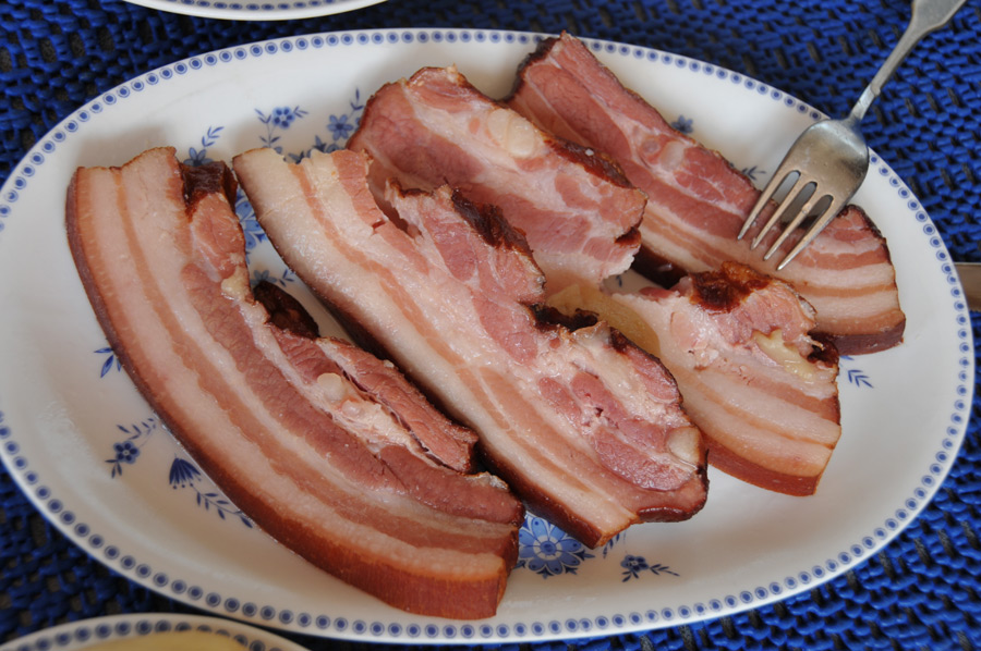 As was to be expected, the time had come on Wednesday around 12:00 p.m.: Hüdel and pears were ready and steaming on the table. Maria and Jochen had already asked for absolute punctuality for the day beforehand, since the Hüdel (although Maria had portioned the Hüdel for 4 people this time) would be ready on time and would not allow any delay or even warming up. We took this to heart and were at the table on time. Surely unusual for some tastes or even hard to imagine, after the distribution of the portions for the number of people, which were spread a little on the plate, then heaped with boiled pears. The cooked streaky bacon was also portioned and served with it.