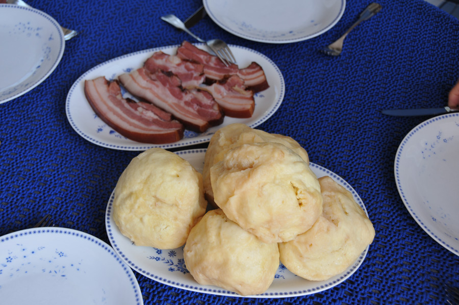 Place the yeast dumpling on the smoked bacon and the smoked boiled sausages (or Kasseler).
