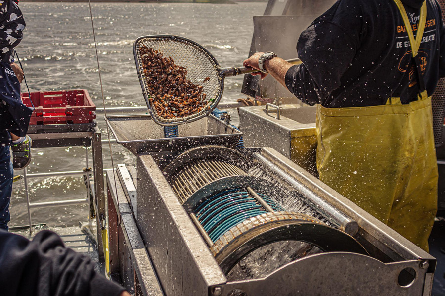 The modern, professional fishermen on their cutters use so-called beam trawls to catch brown shrimp. With the rising tide, the few remaining fishing boats leave their harbors and go to their fishing grounds in the Wadden Sea. The net is lowered to the seabed in shallow water and pulled across the seabed like a bottom trawl with the help of the beam trawl. After a certain fishing distance, the nets are hauled in and the catch sorted through directly on board. By-catch is thrown back into the sea as quickly and alive as possible. Many shrimp fishermen today are also very ecologically minded and treat nature and wildlife with care. The sorted rest of the catch is boiled with seawater directly on board, which changes the color of the shrimp to pink to reddish brown.