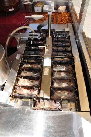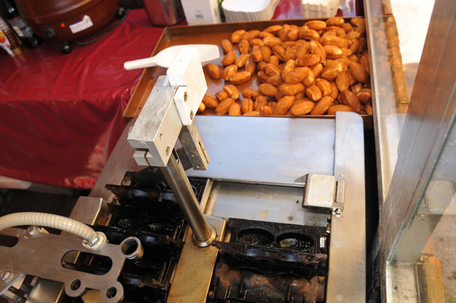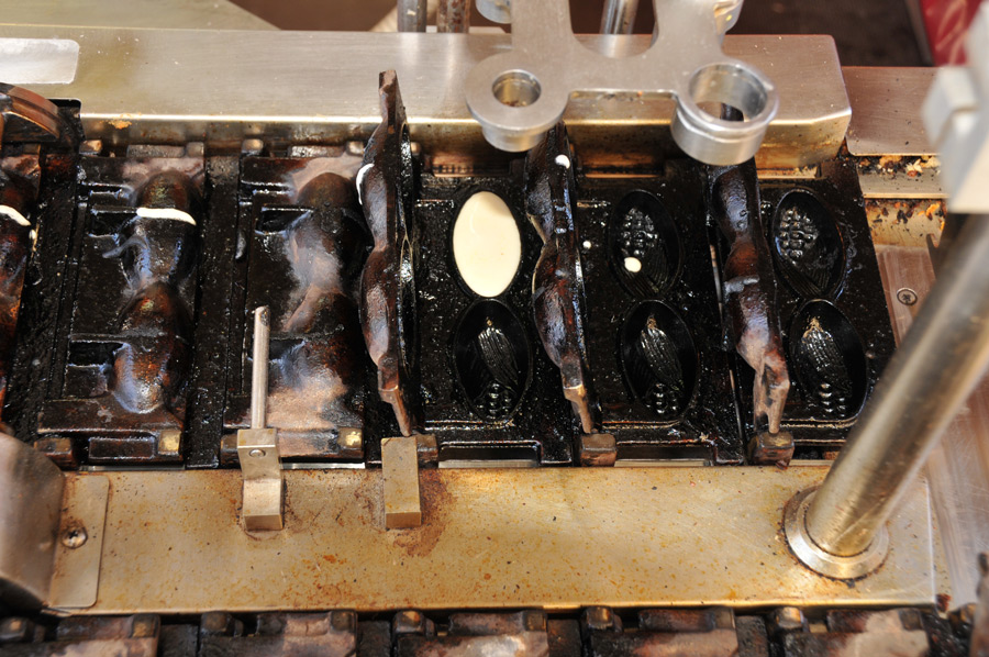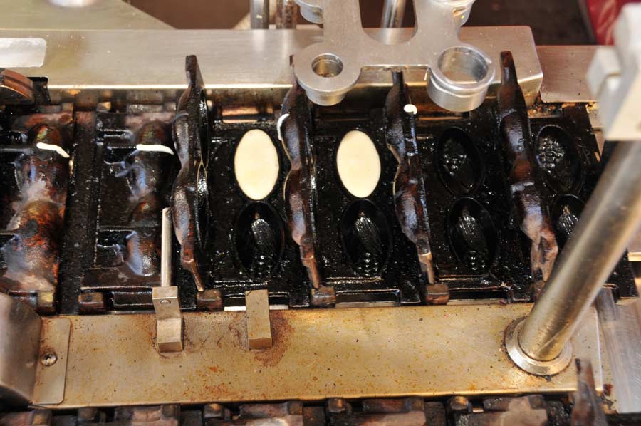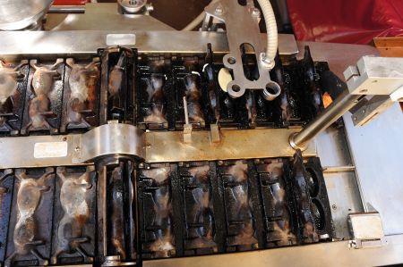 After the dough has been made (understandably the recipe is not passed on), the almost liquid mass is filled into a storage container. A quantity of dough corresponding to the shape is pumped into the waffle blank via a pump hose. Then the waffle maker closes automatically by attaching a counterpart as a lid. Up to four waffle Molds can be filled at the same time, depending on how the waffles are sold. Now a motor pushes the filled waffle iron a little forward, waffle irons that have just been emptied get under the filling device. The baking heat comes continuously from below to all Molds, so that there is always baking temperature. Around the middle of the baking system, four irons are turned at the same time and then the heating plate is placed back. This way, both sides are baked evenly. At the end of the baking line, the Molds are also automatically emptied into a large storage container.