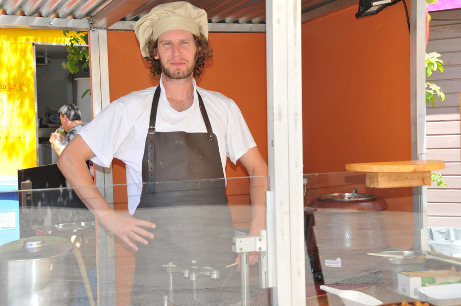 Together with Lydia and Georg, singer, guitarist and bandleader of Backdoor Connection, we had started the evening tour when we got hungry. All kinds of delicacies are extensively provided at the Grenzenlos, so that you can always keep an eye out for special delicacies. So we came across a small, inconspicuous stand that offered just such small but fine waffles. A waffle isn't really anything special at first, because there are a wide variety of shapes and combinations of these age-old pastries, which were topped with a icing of liquid chocolate at this stand.