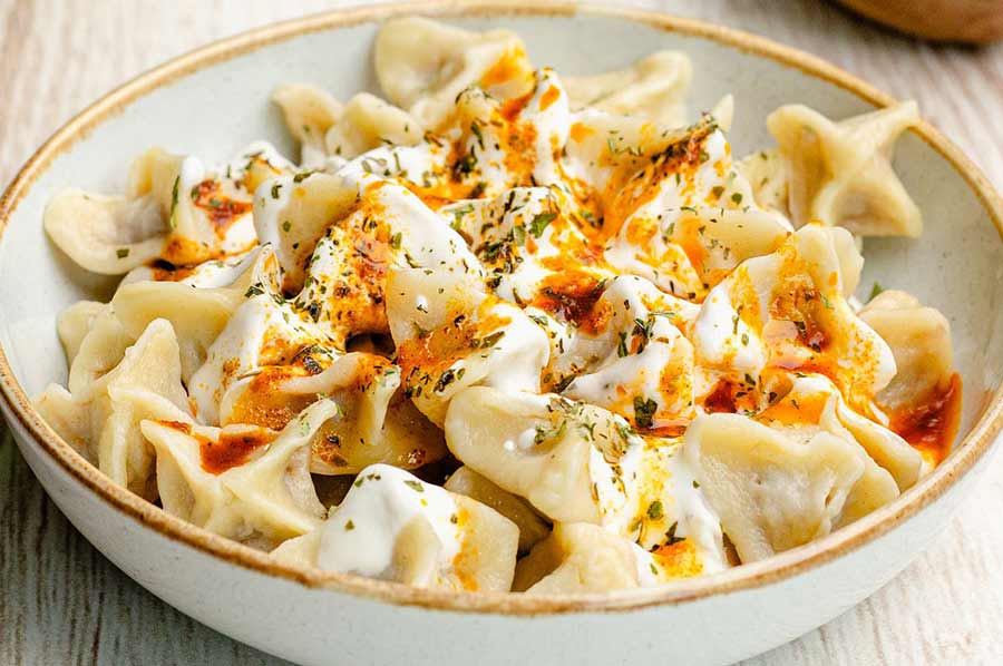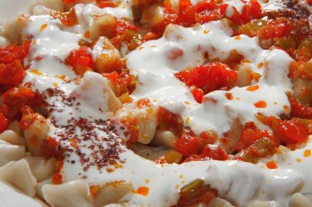 Mantı are the Turkish version of pasta pockets, which are mainly filled with minced meat, then served with creamy yoghurt and finally decoratively covered with a spicy, buttery tomato sauce or paprika sauce.