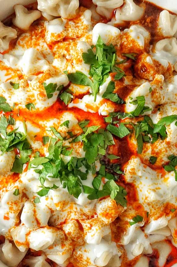 The mantı are now cooked, drained and distributed onto the plates. The cold yoghurt is now spread over the mantı, so that the consistency of the hot mantı and the cold yoghurt on top alone has an interesting note. The crowning achievement is now the second, again hot red sauce, which is usually poured decoratively in a circle or cross shape onto the white, cold yoghurt.