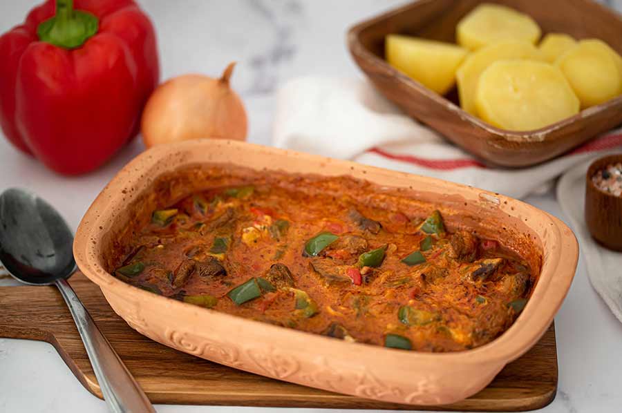 In Cappadocia, to be precise in the town of Ürgüp, while visiting a weekly market, we came across vegetable stews that, although smaller in form, demonstrated steam cooking in their own juice in an almost perfect way. The vegetable and meat mixture of your choice was placed in small clay pots and closed with a lid. To ensure that no liquid escapes during the cooking process, the lid was “sealed” with bread dough. During the cooking process, a circular bread was baked at the same time. See image gallery. A little observation sometimes reveals surprising variants of actually known procedures. The same applies to almost all methods of cooking in your own juice, especially when using clay pots: