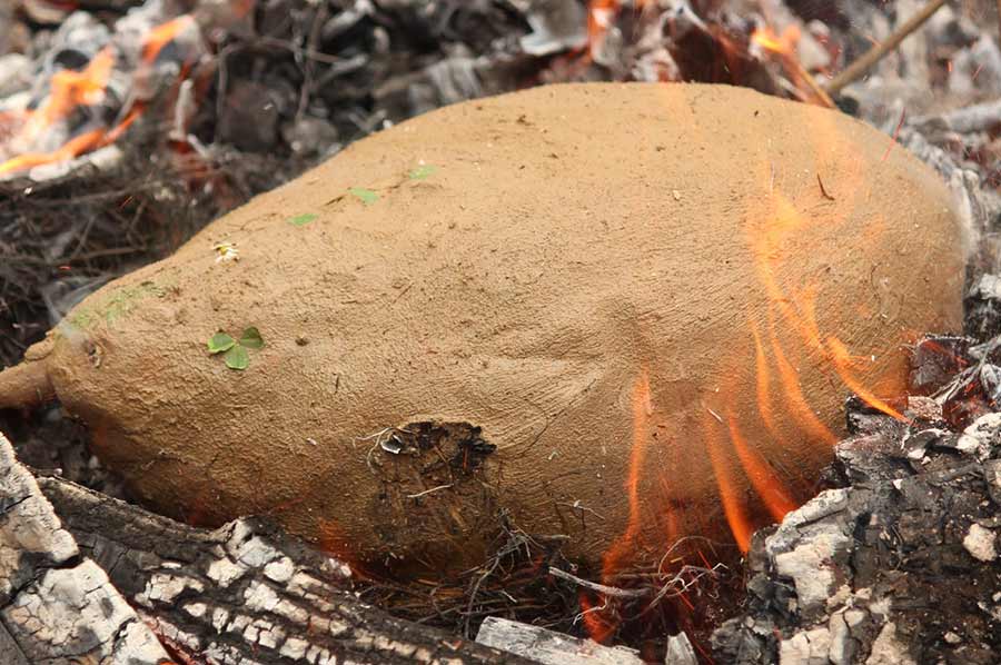 The only important thing is that the fire must not go out. The principle slowly became clear to us because we had already heard of so-called earth ovens from other cultures. We were excited to see the results of this type of cooking.
