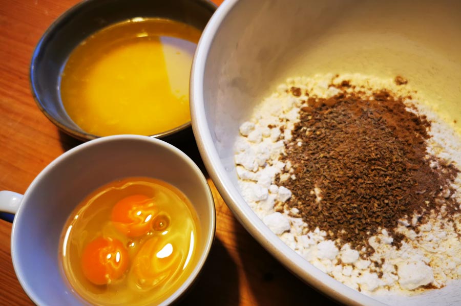 First, the sugar is dissolved in hot water, then the liquid is allowed to cool. Now melt the butter and let it cool. Then, using a hand mixer, beat the butter until fluffy and gradually add the eggs, spices, sugar syrup, and flour. The batter should be thin and easily slide off a spoon. Let the batter rest overnight, then test the consistency again with a spoon (if it's not thin enough, simply add a little more water).