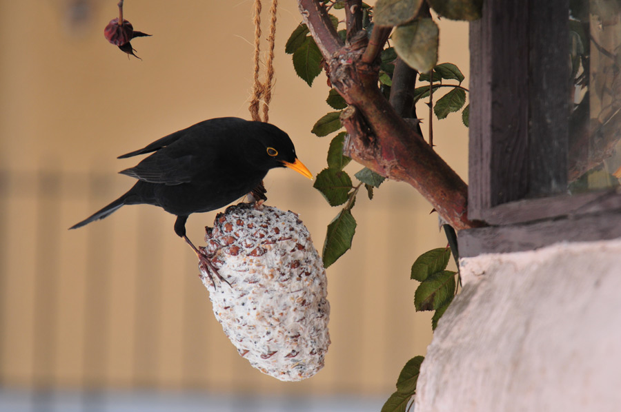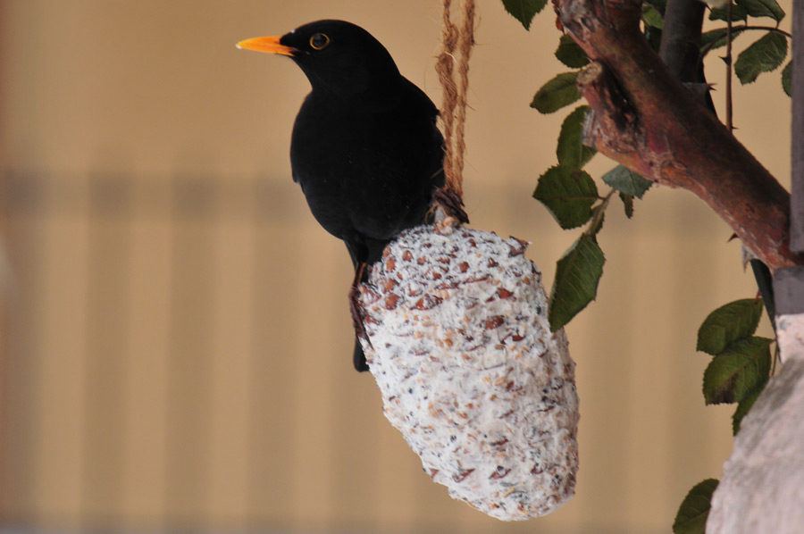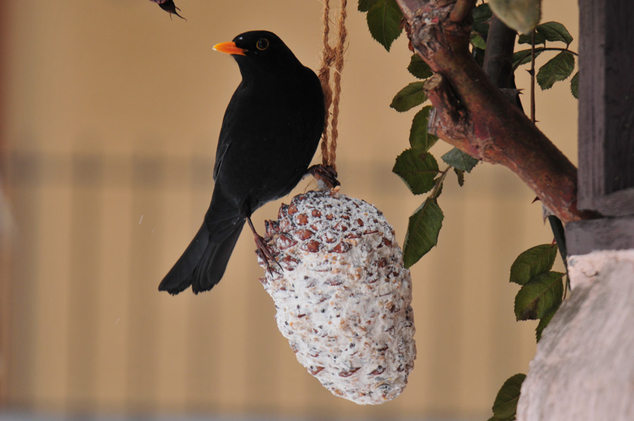 During breakfast, as usual, some birds came up to the window sill, where they found a bowl of water that was very much frequented. This has been customary for years and the birds have got used to our movements behind the window. We quickly got the idea of donating food to the birds, now that everything is covered with snow out there.