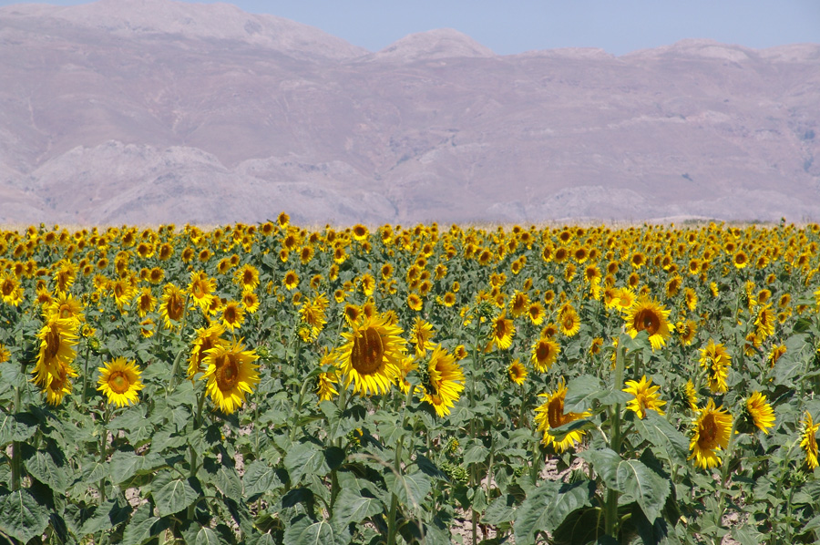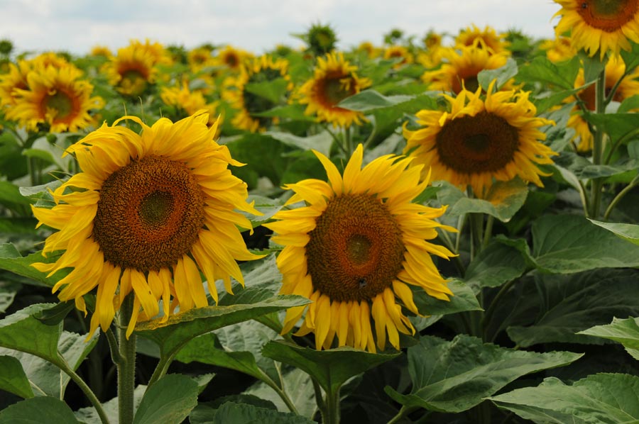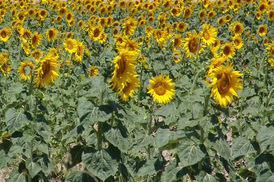 With the discovery of sunflower as an oil plant the large-scale cultivation in the agricultural industry began. The main growing areas for sunflowers today are China, the United States, Russia, Ukraine, Turkey and the rest of Europe. To grow the sunflower requires humus and nutrient-rich soil, sufficient supply of water and heat. In the agricultural industry, the sowing is done automatically by machines with a row spacing of 75 centimeters and a distance of 45 centimeters between the plants. For example, about 6 - 7 plants per square meter are set, which then yield 60,000 - 70,000 sunflowers per hectare. If the first leaves die off in the fall, that means harvesting time, which mostly takes place with slightly different combine harvests.