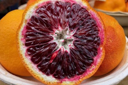 Blood oranges are characterized by a deep red coloured flesh with a tart-spicy to sweet-sour berry aroma. The fruits are still in season until the end of March. But how does blood orange get its dark red colour?