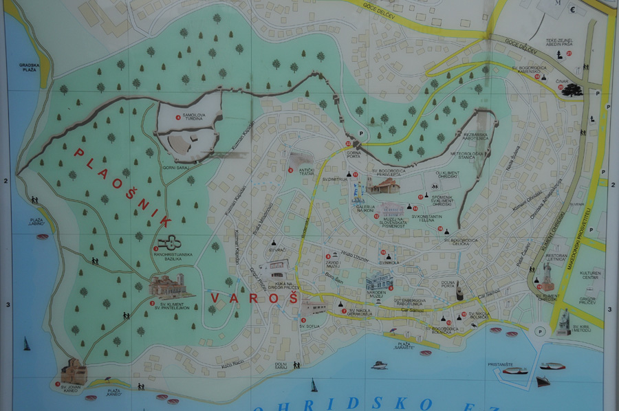 Once being parked the car at the center of Ohrid, we first encountered a large street and road map, which we initially wanted to use to explain the planned hike on the tour through Old Town and up to the castle. From the port, the views of the medieval houses downtown initially obtained, and, despite real gray sky, the splendidly buildings in Ottoman style with typical bay windows are absolutely worth seeing.