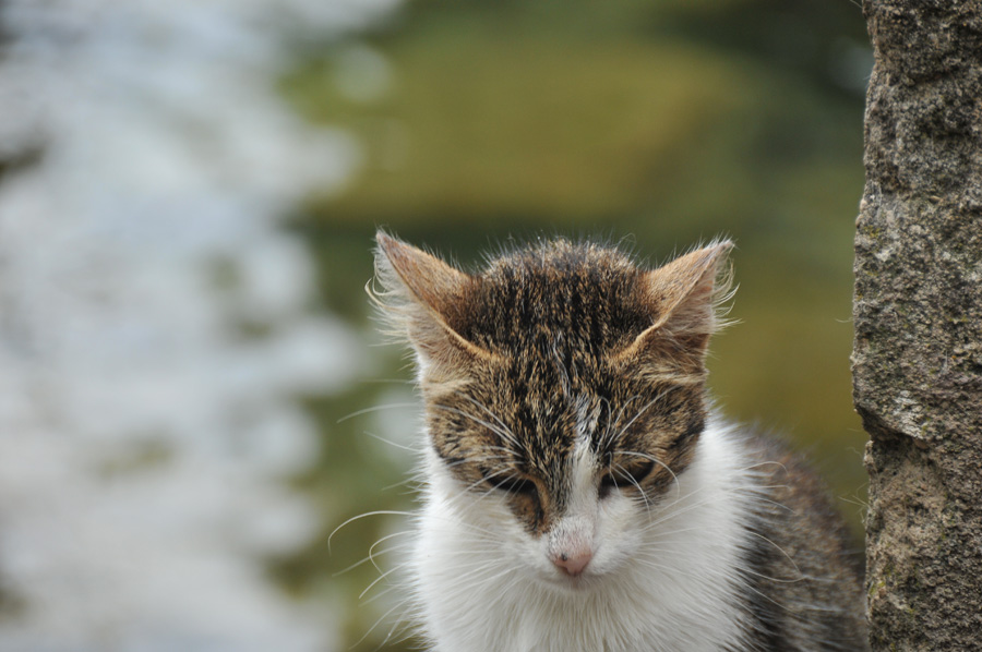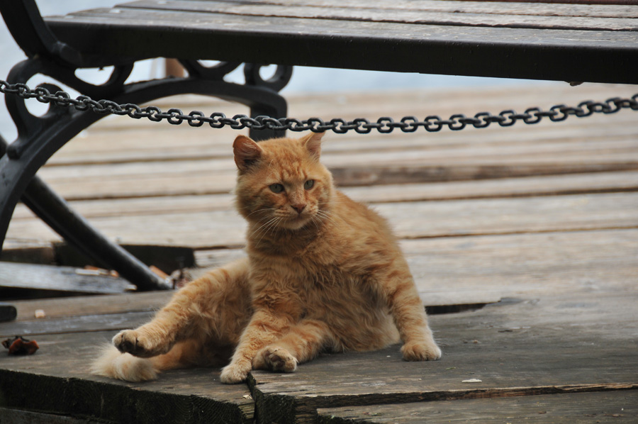 Here the pedestrian street leads down to the lake and we follow the wooden bridge that leads along the lakeside as a path to the beach sections with small beach bars and restaurants. However, we also observe a short playing episode and resting of the animals on the way.
