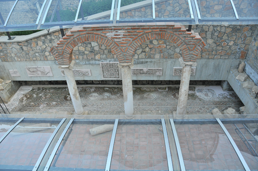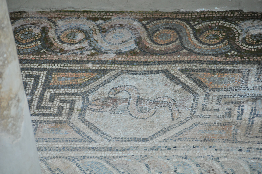 A little below the theater there is another excavation site of a basilica, which has had excellent floor mosaics once. Partly, but only partly covered, by an indeed architecturally interesting but unhelpful construction that was actually built for the protection of the mosaic, so damage to the mosaic can be seen now caused by rain and snow.