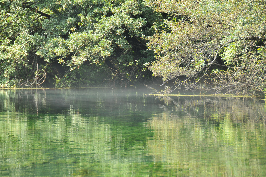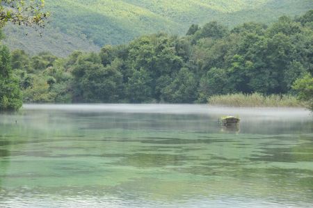 This magnificent and at the same time interesting destination is best being explored during your stay at Ohrid Lake by rowing boat, which can be hired at Sveti Naum. We were again on the spot and noticed, that, due to the autumn sun, misty veils had developed over the water, which additionally provided for some spectacular moments. For a really small money a rowing boat with charter leader is booked, which is ready for extensive explanations and above all knows the places of the springs exactly. You have to take a close look and avoid any wave-induced movements in the boat to see the small bubbling springs at the bottom of the karst, which have carried fine, white sand from the karst, which as a moving edge easily burrows. No question of visibility, because the water is so clear that one can clearly see every plant on the ground up to 4 meters deep.