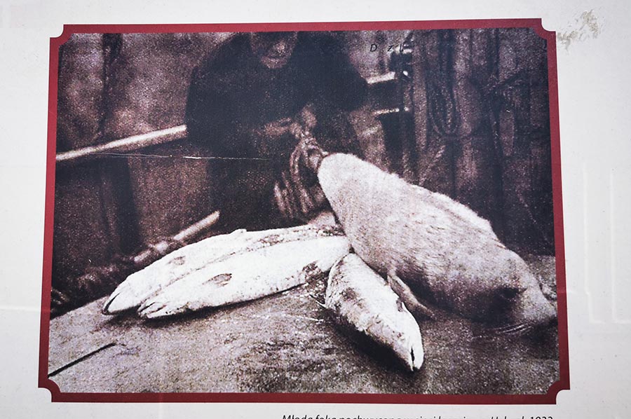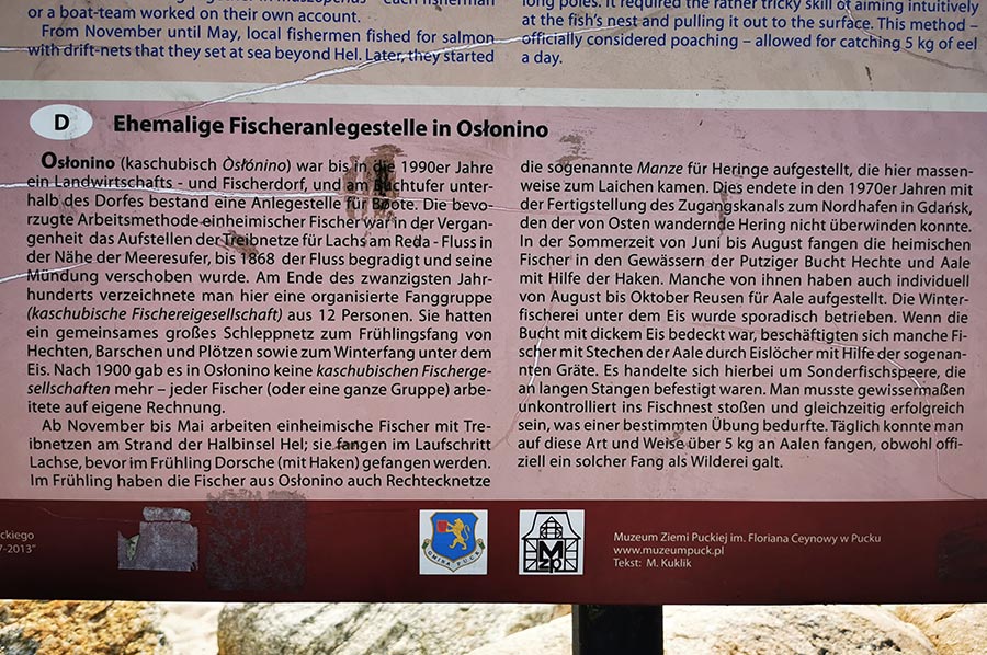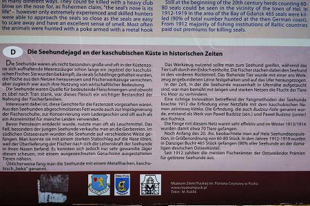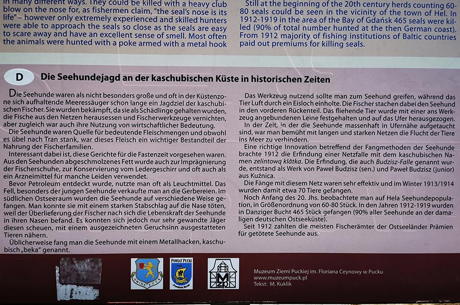 On the shore, some signs point out the fishing methods of the Kashubians, who have lived here for centuries. In particular, their methods of fishing, in turn those of seal catching, are described. We were particularly surprised by the last sentence: Since 1912, most of the fishing authorities in the Baltic Sea countries have been paying out premiums for killed seals. We'll ask if that's still the case today.