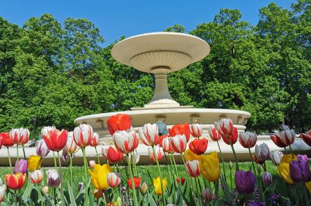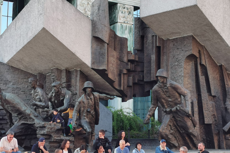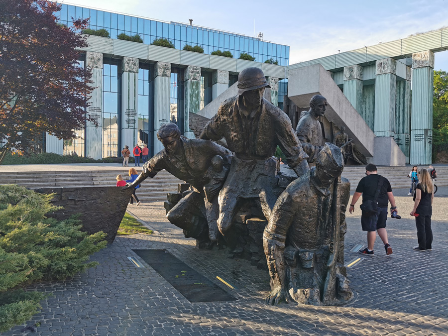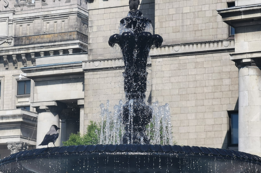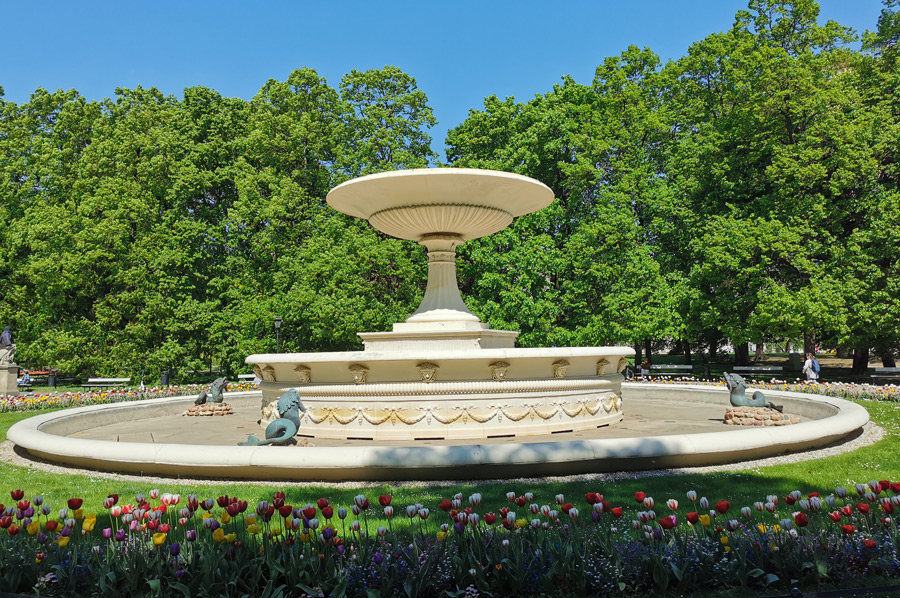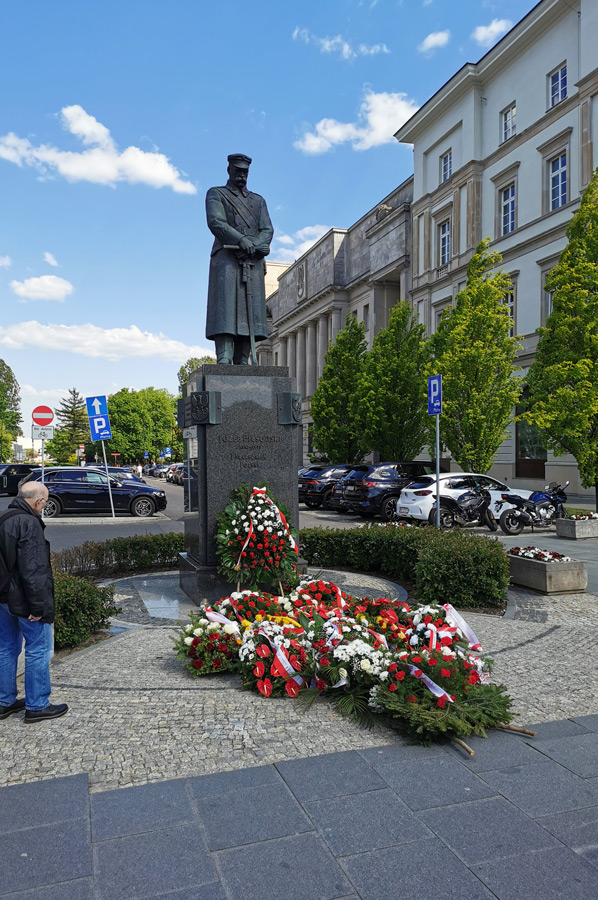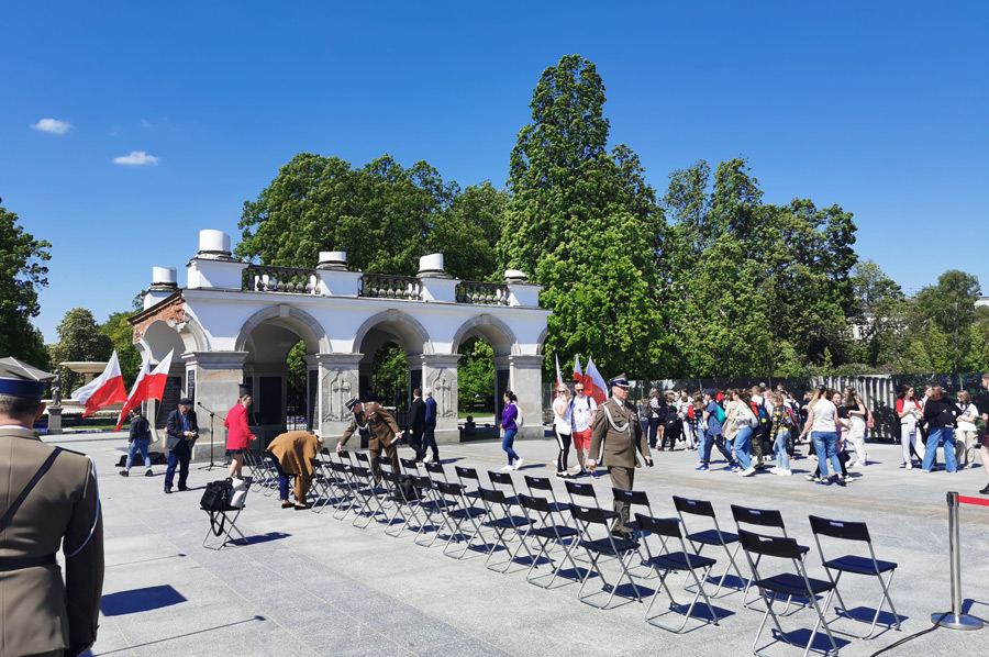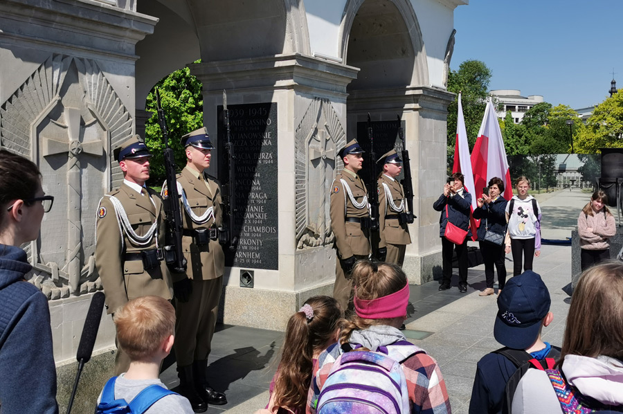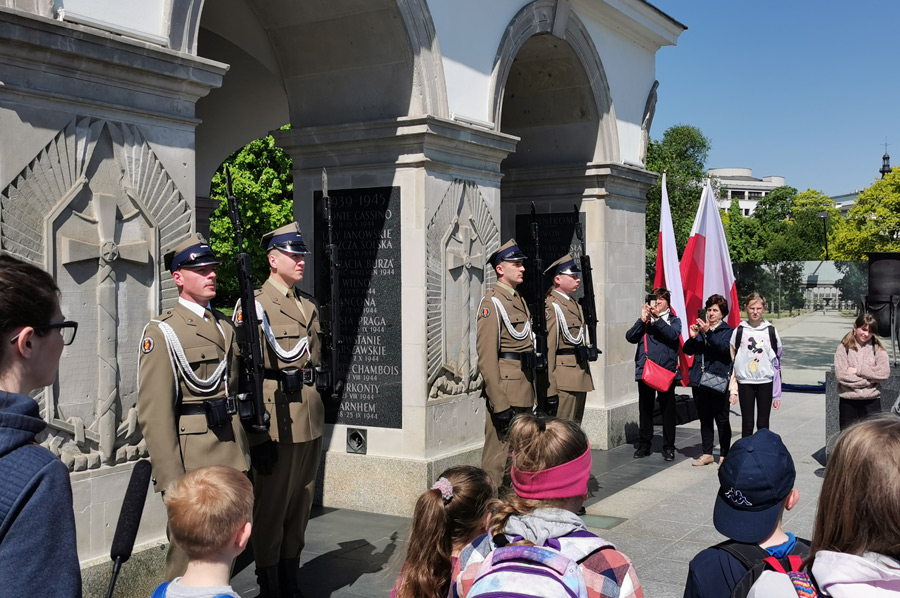 We continue our tour along Ulica Marszałkowska, which is one of the most important north-south traffic arteries in Warsaw. The Marszałkowska extends over a length of 3.8 kilometers through the entire inner city district and runs parallel to the former royal wing at a distance of around 600 meters to the west. It was the city's most important commercial street until the Second World War, in which most of it was destroyed. Through the Saxon Garden, which is a public landscape park with baroque statues, a large fountain, monuments and tree-lined paths, which is heavily frequented in today's wonderful weather, we reach the Monument to the Unknown Soldier and experience a changing of the guard of the soldiers positioned here. A large number of onlookers quickly gathered. The monument to the unknown Polish soldiers who died in World War I is a remnant of the destroyed Saxon Palace.