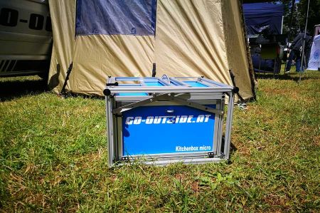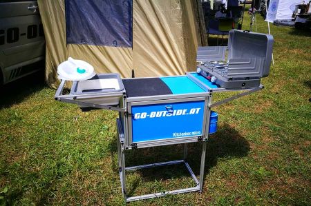 Slowly, the first concept crystallized as a portable or mobile camping and outdoor kitchen, which has a unique and later patented folding system that is easy to transport. The folding system alone seemed so practicable to us during the presentation, that we decided on an article for the product: simply always and everywhere applicable. The picture gallery at the end of the text impressively shows the simple and quick construction of the kitchen, whose frame can be adapted to even uneven terrain.