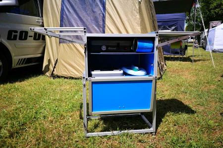 Of course, this also applies to the kitchen, which brings us back to Sascha and Hannes. So we were very pleasantly surprised when we met on a compact "box solution" of a compact kitchen at the booth of the two, which started just to see the construction. Impressed by the compactness and the quick setup time, the very good design of the frame and the components and their practicality, we were surprised. We gladly received information about the basic idea, the first prototypes as well as the 5 size solutions now produced in series.