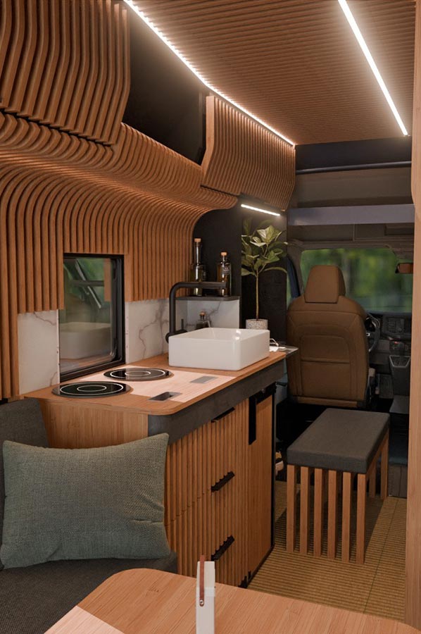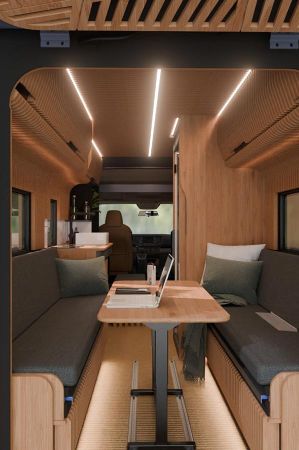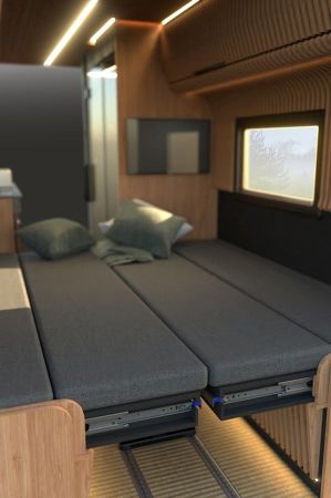 All models in the Alpine Cross Cabin series offer a new mobility concept that combines the comfort of a traditional motorhome with an optimized space for remote work. In other words, a seamless combination for the perfect work-life balance, hence the name Cross Cabin. The Alpine Cross Cabin Signature is the brand new flagship version of the series, with further models to follow throughout 2024: The Alpine Cross Cabin Adventure will be based on the MAN TGE 4x4 and will focus on off-grid excursions, while the Alpine Cross Cabin GO based on the more compact Toyota ProAce allows maximum mobility even in crowded urban areas. For the interior design of all Cross Cabin models, Alpine has adopted the Japanese aesthetic of minimalism and order - items are within reach when needed, but stored safely or even out of sight when not in use. This guarantees a tidy, harmonious interior environment that feels professional and relaxing at the same time. The wall and ceiling paneling in a slatted design is made of Queenply real wood panels with bamboo surfaces. Integrated, soft LED lights create a very cozy, harmonious atmosphere. The floor is equipped with tatami-style mats to complete the feeling of minimalism and functionality - a design unique to camping vehicles or motorhomes.