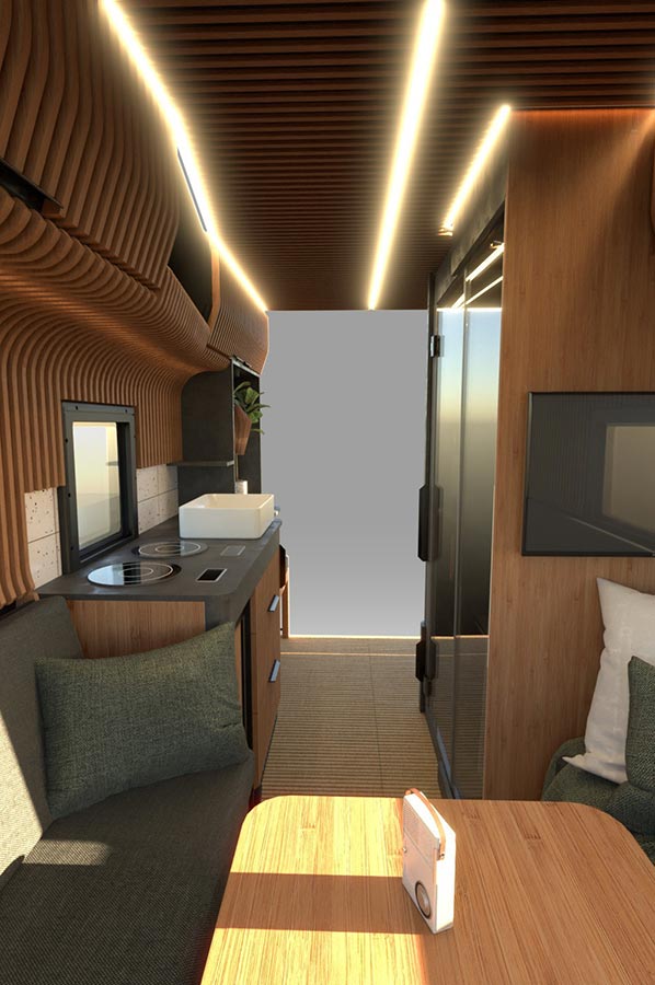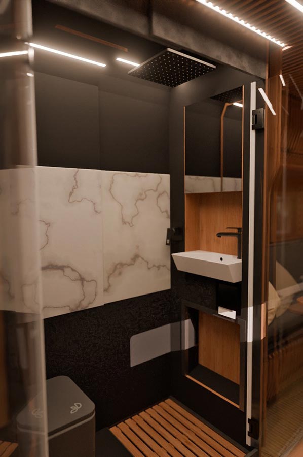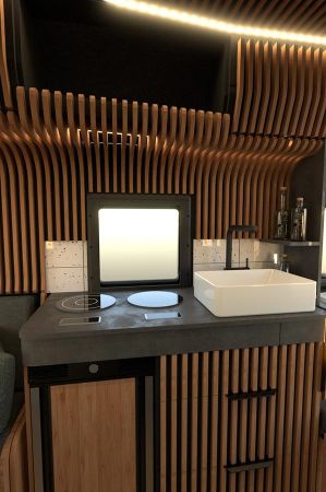 The kitchen area of the Alpine Cross Cabin Signature includes two 800-watt induction hobs, a sink and a 70-liter Dometic refrigerator integrated into the kitchen unit. There are multiple drawers and overhead compartments for kitchen appliances, cutlery and other household items. The side wall of the bathroom can be pulled out to almost double the size and reveal the hidden, high-quality shower cubicle in marble décor with rain shower and sink. When folded, the bathroom only functions as a toilet, giving users additional space in the entrance area. Converting the conference and dining area into a full bed for 2 people takes place in seconds: the conference table is pushed down, then the two bench seats slide down and meet in the middle to create a large lying area. There is ample storage space for linens and pillows under and above the bench seating. The Alpine Cross Cabin Signature also has a diesel auxiliary heater and an electric hot water boiler. The control and monitoring of the electricity and water management is done via an 'Arvikon' interface, which can be operated via a large touchscreen or the Alpine Halo11.
