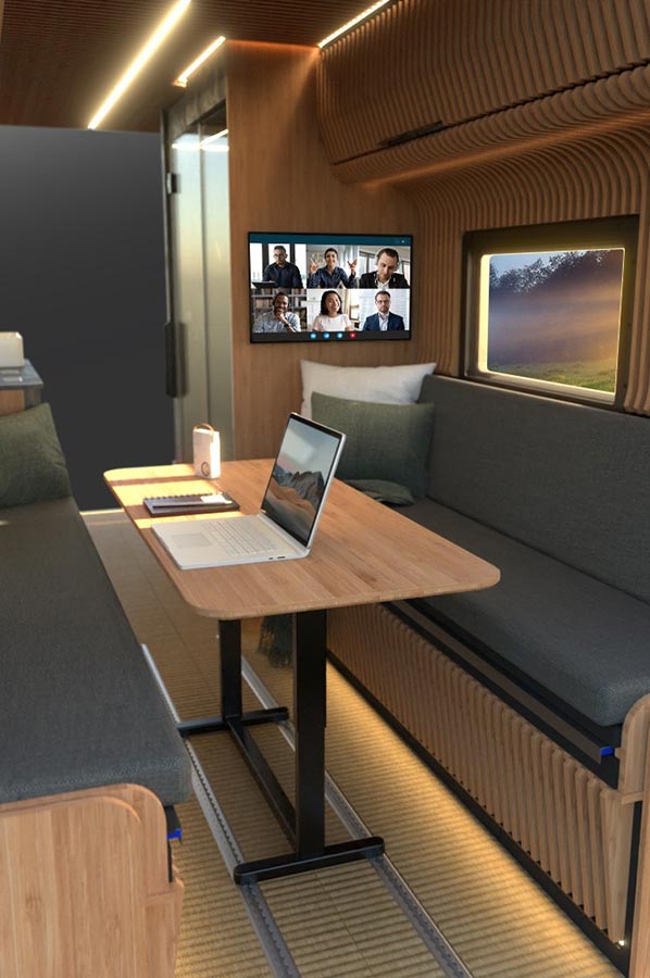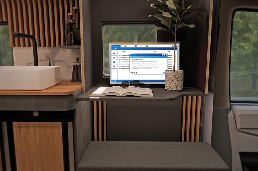 The Alpine Cross Cabin Signature was designed to create a mobile work environment on the go. The conference and dining area in the rear is equipped with a 1.30m long table that has USB, HDMI and power connections. Additionally, a large touchscreen monitor can be used to present files or as a digital whiteboard. The separate PC workstation next to the entrance door has a pull-out 27-inch LCD monitor to which an external laptop can be connected. The Alpine Cross Cabin Signature offers a high-speed 5G mobile router with an external antenna, enabling video calls, streaming and cloud-based work in perfect quality. The vehicle cabin is soundproofed from the outside environment to ensure uninterrupted video conferencing in noisy places or in heavy rain.