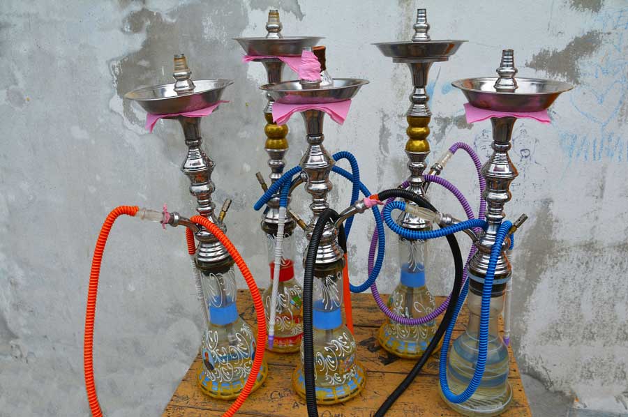 To make the tobacco wet enough so that it will smoulder for a long time is a special skill. It also needs a lot of practice to be able to organize the coal on the tobacco so that it is burning properly. Today it is much simpler. The waiter offers the well prepared hookah to his customer together with some pieces of hot coal which are necessary for lighting the tobacco. Instead of using unpleasant herbs, as they did in former times, you will now find light mixtures of apple, banana or even Cappuccino flavours. This new tobacco, mostly imported from Egypt, is one of the main reasons why using a hookah has become so popular again.