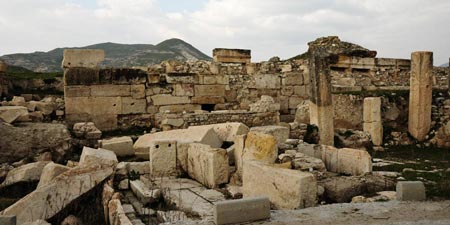 Hierapolis - The ruins of ancient town follow the 1200 metre long and 6 metre wide road which is lined with columns all over the travertine terraces of Pamukkale from north to south.