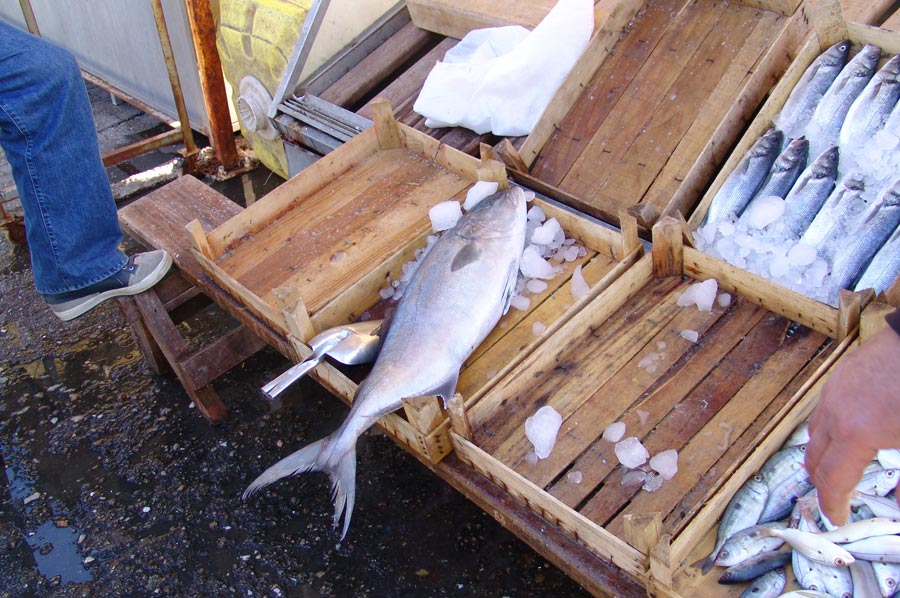 The fresh fish, stuffed mussels, grouper and especially octopus caught in the fishing nets have been laid on ice and displayed, ready to be chosen for lunch or dinner.