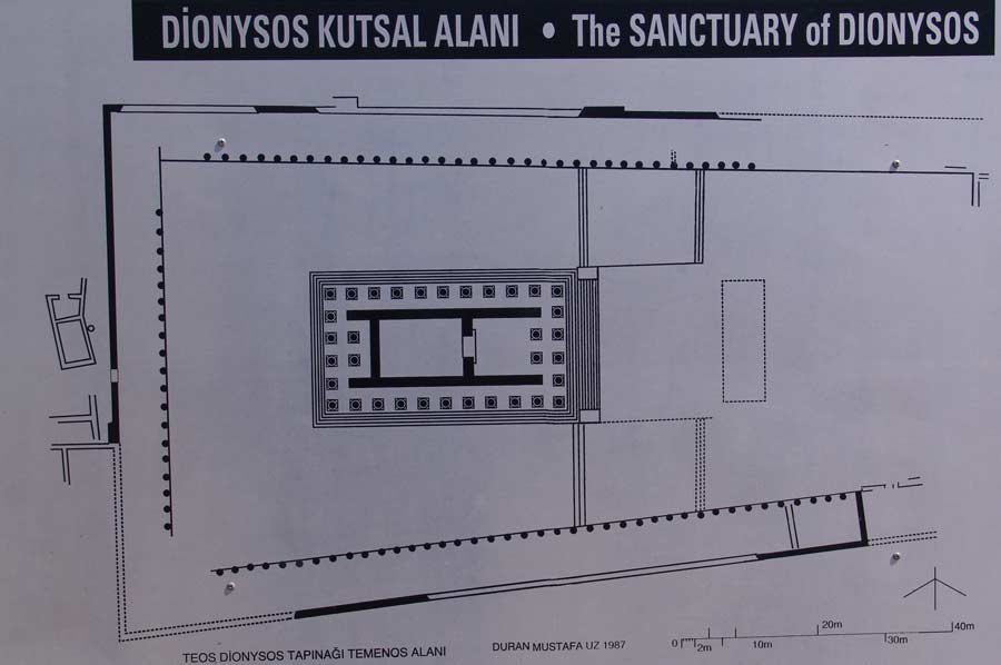 The most important god worshiped in cult celebrations was the main god Dionysus. Dionysos was worshiped so much in the form of festivals and musical competitions that a monumental temple building had to be planned. For years Teos had tried to get to the holy and inviolable city (polis hiera kai asylos). With the architect Hermogenes, who lived in Teos, a planner and builder was then able to follow this desire for a Dionysus temple and in 220 BC construction began. About 30 years later, the temple was completed in 190 BC, making it the largest temple of Dionysus in Asia Minor. Almost at the same time, an 11-row Odeon and a Hellenistic theater were built on the slope of a small acropolis.