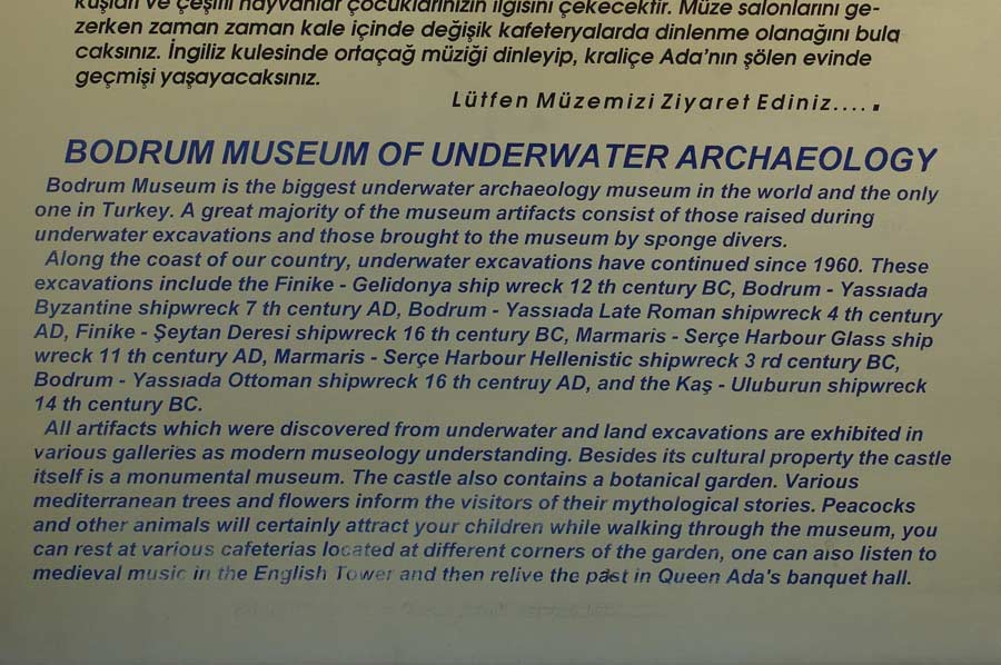 Bodrum Museum is the biggest and most important archaeological underwater museum in the world and the only one in Turkey. A great majority of the relics on show consist of those raised during underwater excavations and those brought to the museum by sponge divers, now on display in the museum located in Bodrum Castle.