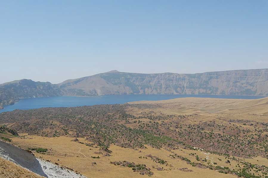 One of these explosions in the Holocene is also responsible for the current shape of the volcanic mountain Nemrut, because the entire summit collapsed after the complete emptying of a huge magma chamber underneath, so that an immense crater basin of about 7 kilometers in diameter was able to develop. Craters of this type are also known as calderas. Over the years, the Nemrut caldera has filled up with a lake about 155 meters deep, made up of meltwater and rainwater, which is now one of the largest crater lakes in the world. Amazingly, there are two other lakes in the crater named Küçükgöl and Ilıgöl, with Ilıgöl being a warm-water lake about 500 meters in diameter with a water depth of 7-8 meters. Hot water and steam springs are located directly on the edges of the lake, which heat the lake water up to 80°.