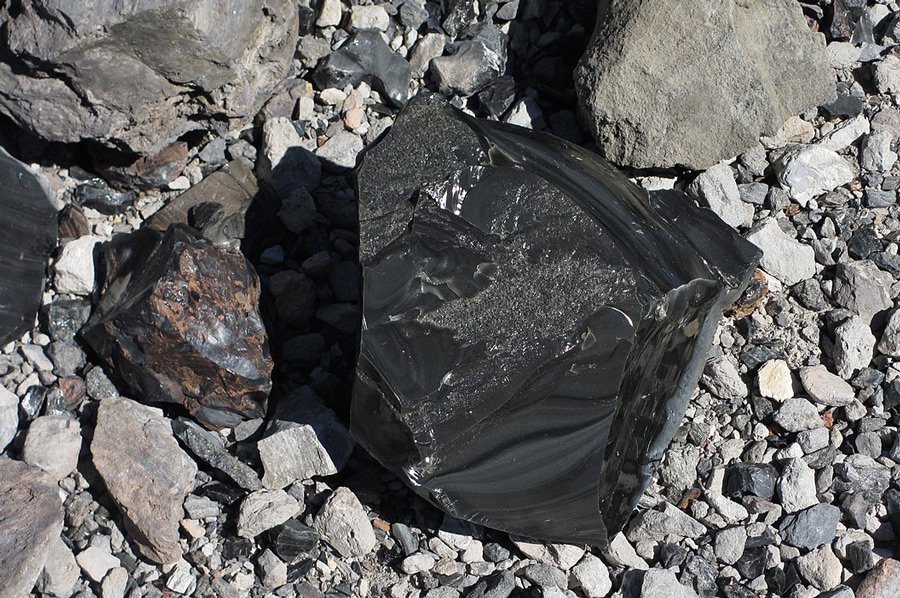 Examination of the lava flow shows a mixture of thin, once-liquid basalt and thick obsidian, a volcanic black glassy material. Already in the Neolithic, Mount Nemrut was known for this material and it was traded as far north as Mesopotamia and the southern Levant. Today, obsidian is found on the southern and eastern slopes of the mountain, with smaller amounts also on the northeastern slopes. Due to its sharp-edged fracture and its glass-like structure, obsidian was often used as a material for the construction of tools. At the time of the Hittites, vessels were made from obsidian, while in ancient Rome polished obsidian was used as a mirror.