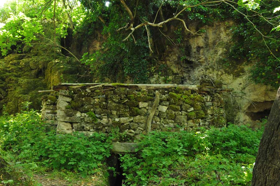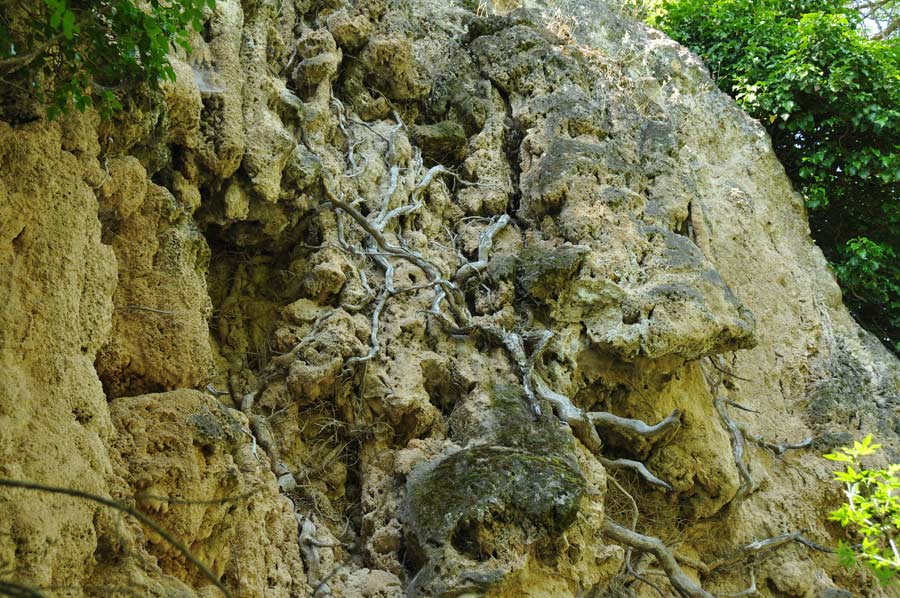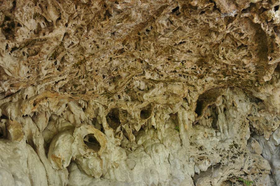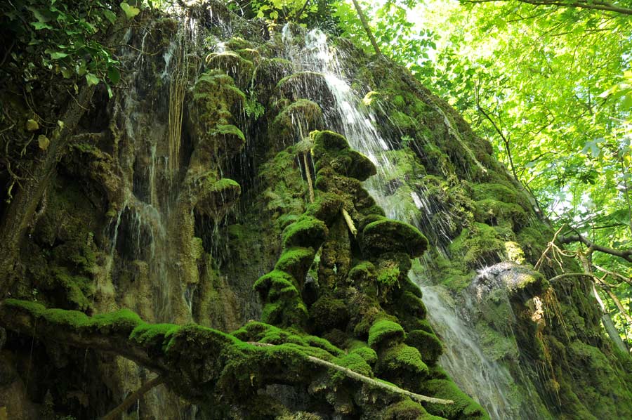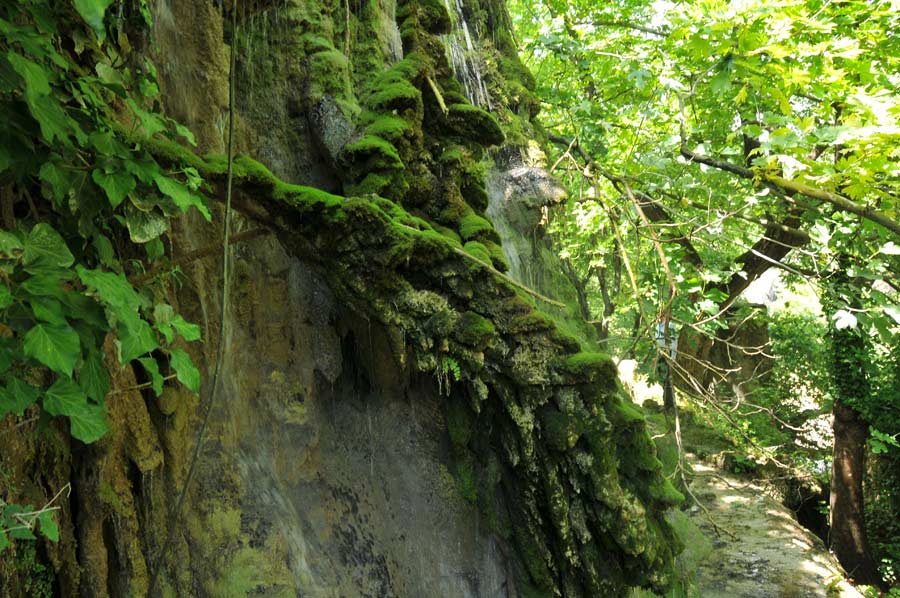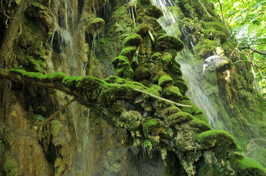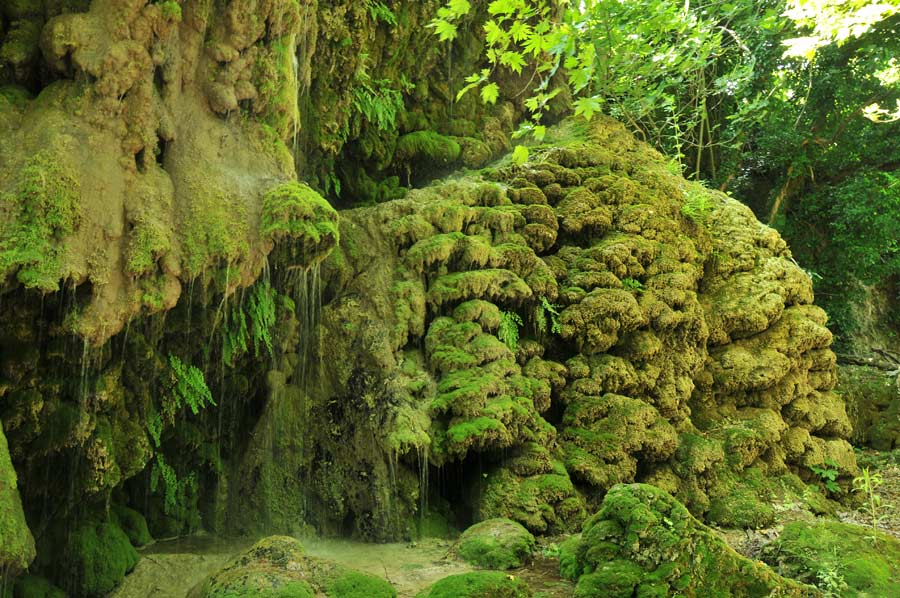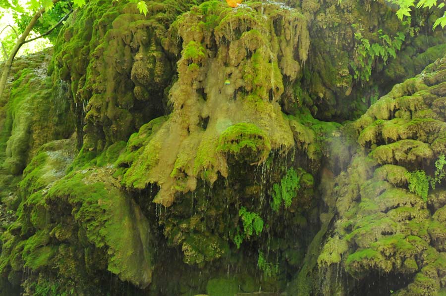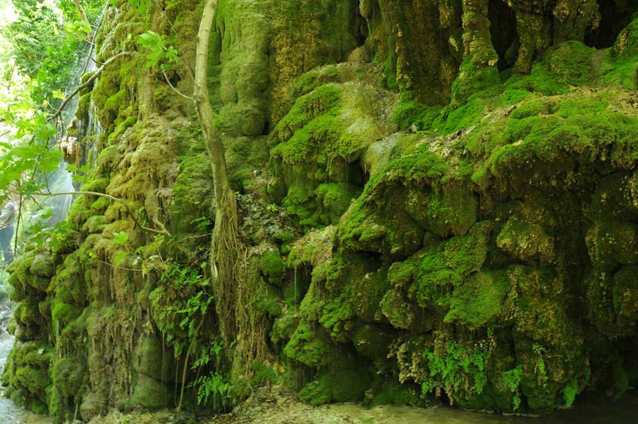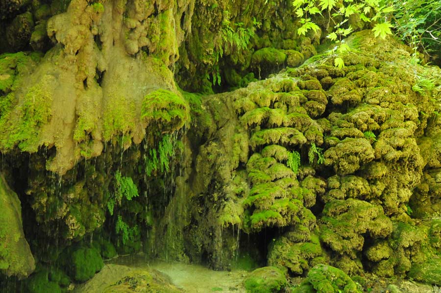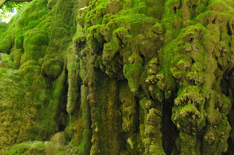 Here on the riverbank there was an area which has been formed by a small waterfall by surface water that had lead to further stalactites, which were now green, covered with moss. One speaks, depending on the arrangement of the stalagmite, of stalactites or stalagmites, another term is used less in common parlance, since the continuous column form is relatively rare.