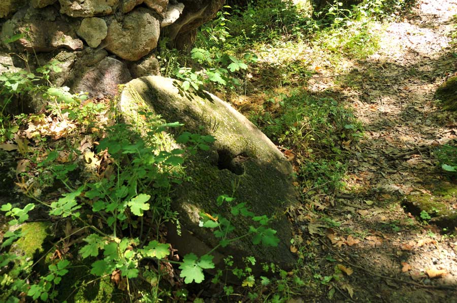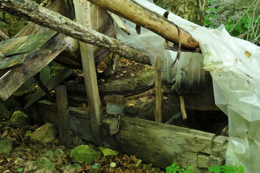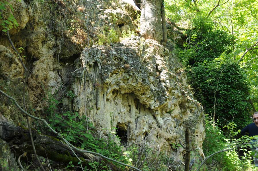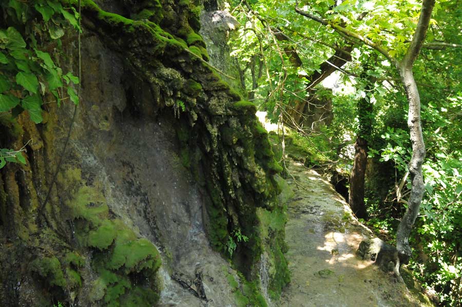 Our local guide took us straight onto a narrow path into the actual valley of Dursunbey Cayi where we should encounter some impressive open air stalactites. Mostly occurring in caves, it differs in the course of Dursunbey Cayi where the cave systems was flushed by the changing direction of the river, and thus can be visited now just by passing by. Stalactites are formed when rain absorbs carbon dioxide from the atmosphere, then seeps into the ground and receives organic acids there. As a result, the limestone calcium carbonate (lime) dissolved in the water. The dissolved lime connects with the carbon dioxide to calcium bicarbonate, which is highly soluble in water.