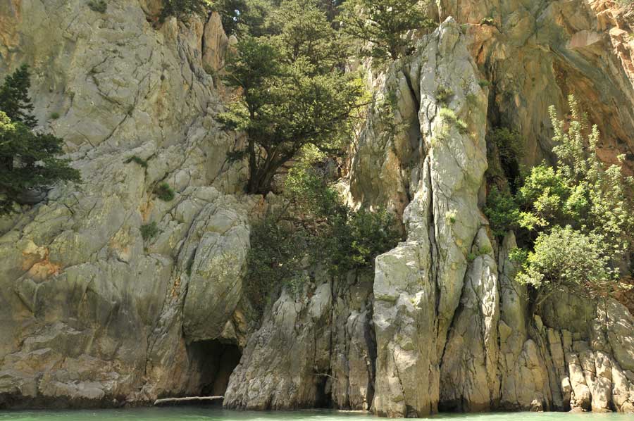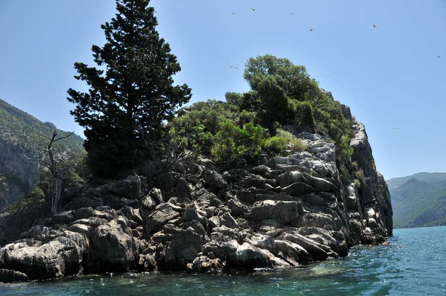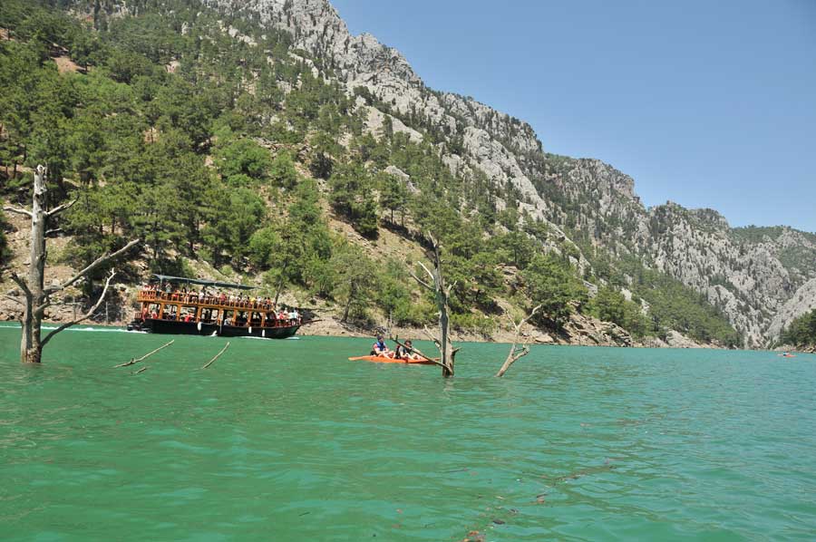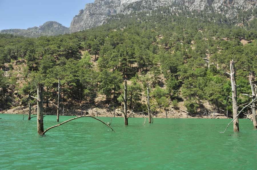 First, along steep rocks, there were a variety of interesting encounters on the way. So we came to some caves, then to a variety of dead tree giants, some of which still towered high out of the water. Then again, there was interesting flotsam, as well as a number of photo opportunities, the time passed by in flight. Of course we had organised some food on the way, so we had a hearty picnic when we arrived at the destination of the excursion, the influence point of the Manavgat River into the reservoir. The current here was so extreme that we had to use the protection of the rocks to get even closer to the falls. The time had passed infinitely fast, so that we made our way back on time, a crucial point as we should later notice. On the way we met some excursion boats, which are heavily frequented as the tourist attraction on the reservoir. Once out of the gorge, it was a really exhausting task to get back to the starting point. Strong wind had come up, which blew against us, so that we really had to fight. Quite apart from the unexpected high waves all the way back to Oymapinar Dam. A real adventure came to an end.